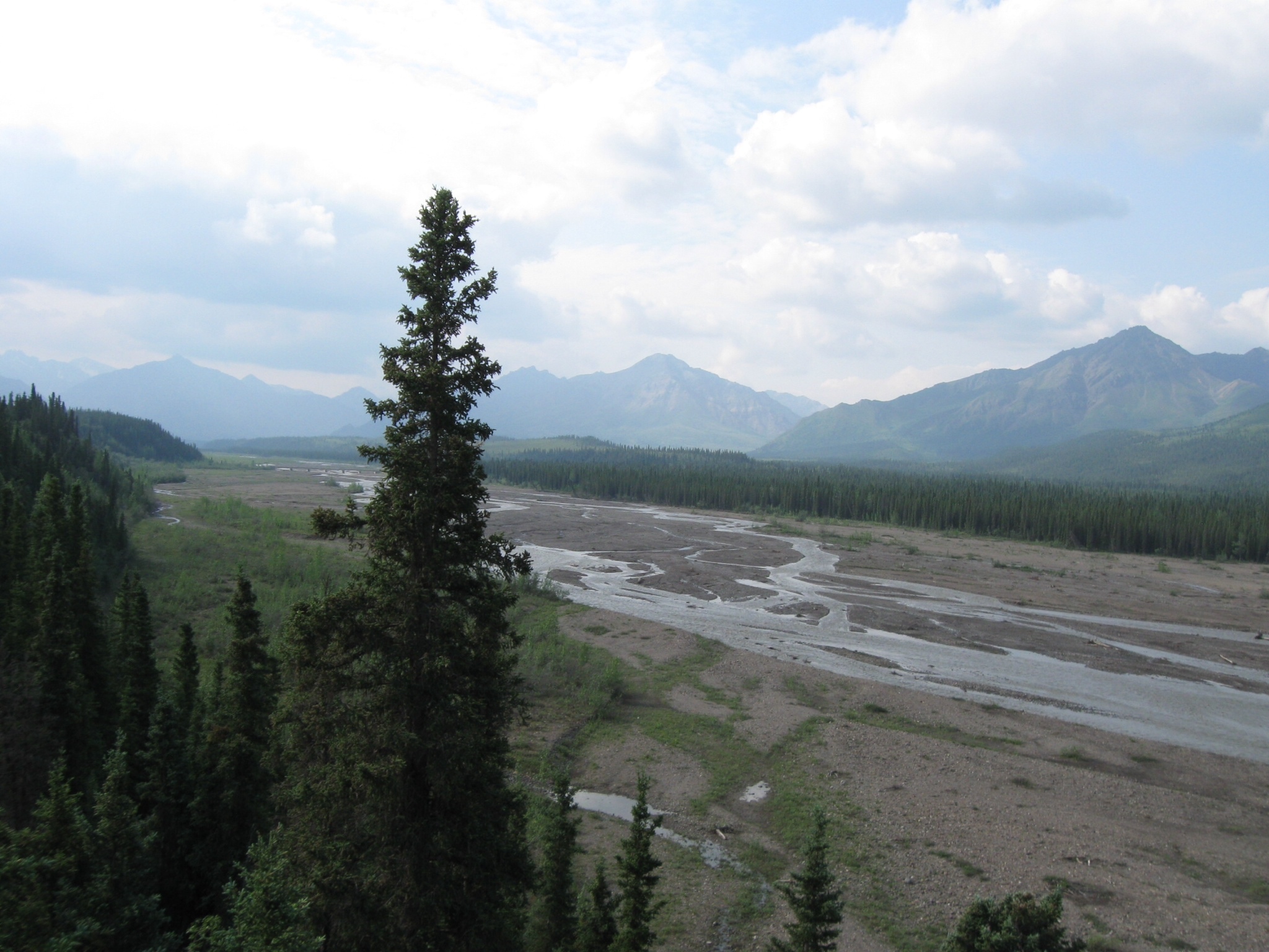 A gray, overcast day greeted us as we stepped outside to load the bikes this morning, a lugubrious beginning to a day that developed into the Alaska that I had expected but had not yet encountered. I had hoped that as we went south, beyond the Alaska range we would be able to turn around and see a clear view of Denali (aka Mt. McKinley) in all its vertical snow-covered glory. But it was not to be.