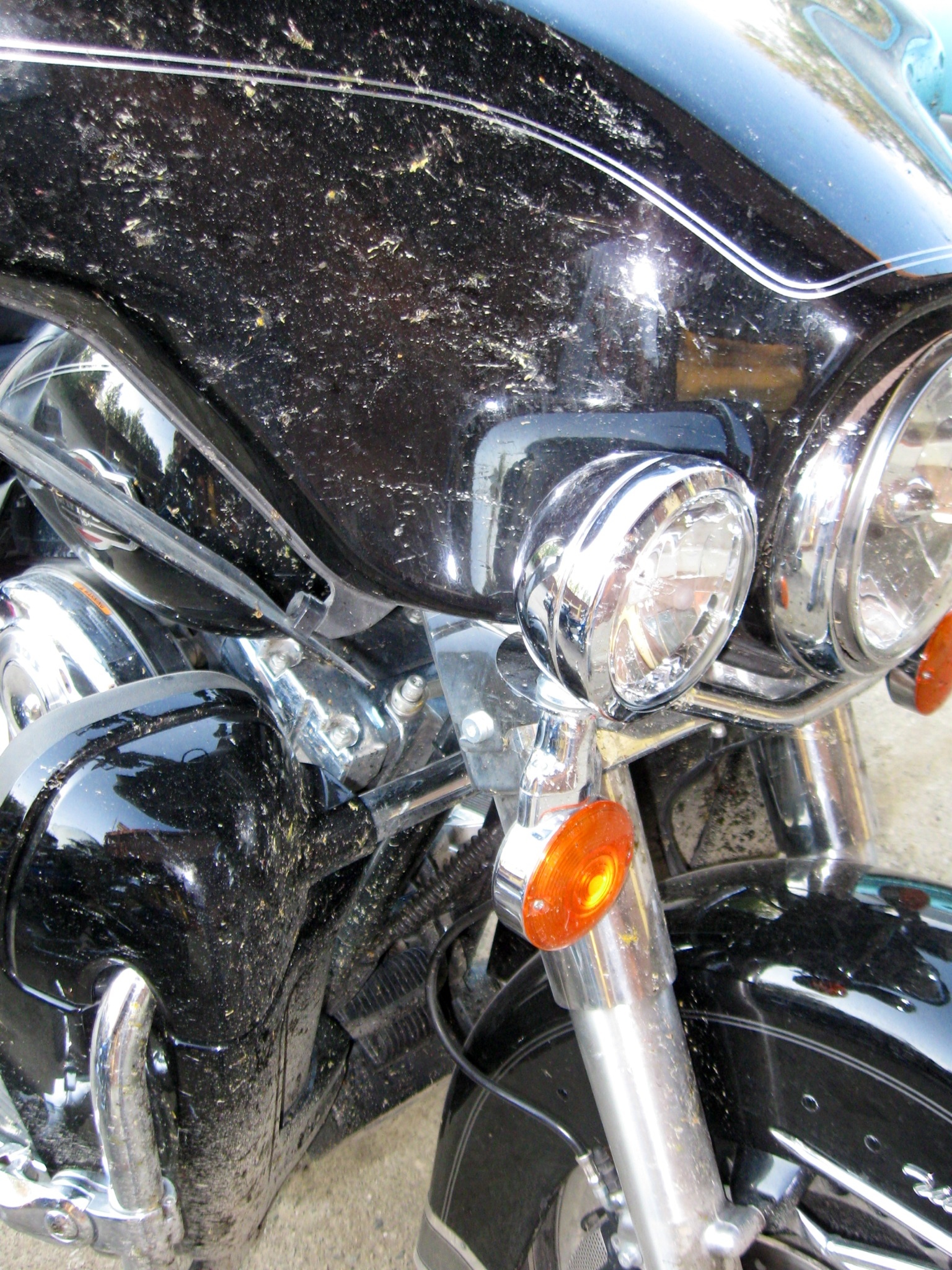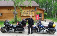 Yeah, right. About another 25 miles down the road, the sign said “Chip Sealing Next 30 Kilometers.” Except this time they were only doing spots of chip sealing. They’d lay down about 100 yards, skip 200, then lay down another 100. But the highway crews were done with their part of the work and it was up to the unpaid traveling public to apparently complete the final phase of this public works boondoggle and try to seal the remaining loose gravel to the road and rid the surface of residual dust by throwing it high into the air where the zephyrs would do their part by spreading the dust cloud to the horizon and beyond. At least we could actually drive on this section at about 50 mph, so, I thought, this won’t be too bad. And then the first 18 wheeler coming the opposite direction roared by (at well above 50 mph, I might add) and kicked up a dust and gravel storm that obscured our vision and pelted our bikes and our selves indiscriminately painfully sharp pieces of small stones. 20 miles of this. And RVs were almost as bad as the 18 wheelers at throwing gravel our way. Still, despite the gravel gauntlet, we made it to Yukon Territory and Watson Lake, about 11 hours after we left Fort Nelson. I was not amused, you can imagine, when I checked for damage and discovered that the right spot light on the Ultra Classic had been shattered by one of the gravel bullets. Oh well, at least with the sun staying up all day, I won’t really need the light.
