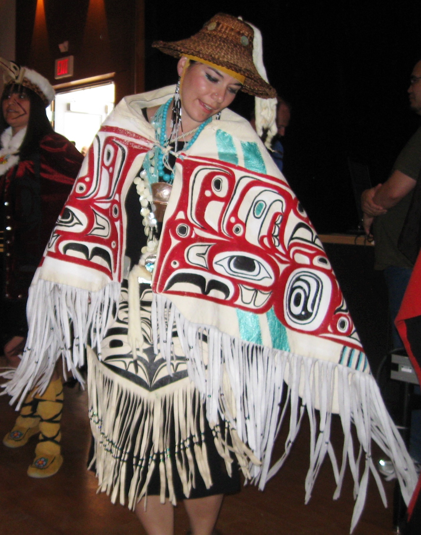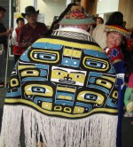 But the multiple highlights of the day came from listening to a dozen groups sing and drum and watching them dance. Their regalia was always interesting and often downright remarkable with intricate beadwork and designs on hand-cured caribou or moose hides. I’m going to post a few more pictures than usual to show some of the gorgeous costumes worn by the singers and dancers. One of the first performances on the agenda was the “dancing” of four new robes painstakingly created by weavers who are very much honored in their tribes. The robes/blankets tell a story, usually about a family, and are passed on from generation to generation.