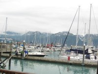 We arrived in Seward for our two-day stay hungry and ready for fresh seafood in this fishing port town. We weren’t disappointed by the suggestion made by the motel clerk who checked us in and directed us to Chinook’s for dinner. All the fish they serve is Alaskan and it’s fresh. Yesterday my salmon and Marilyn’s halibut were happily minding their own business in their native habitat and today they satisfied our fishy dietary cravings. We very much appreciated their sacrifice on our behalf. Not only was the dinner the best we’ve had in a long time, but the scenery outside the floor to ceiling windows next to our table added an ambience not found at most McDonalds or Taco Bells. A glass of Jack Daniel’s Single Barrel and two delicious Washington state wines were the perfect beverage accompaniments. Aaahhhh, life is good.