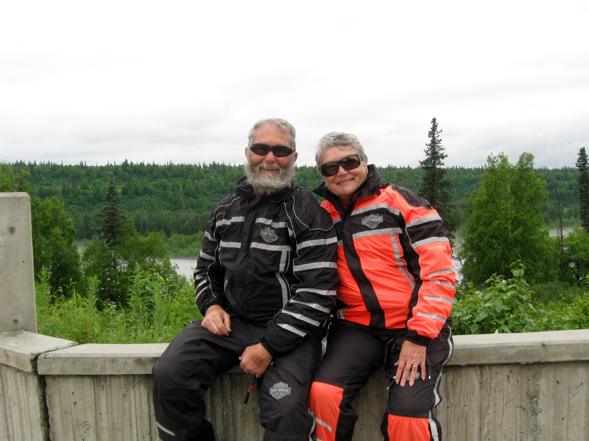 A few miles south of Cantwell, at about the spot I expected to begin to see a view of “the high one,” the temperature dropped from about mid-60s to mid 50s and we began to get rain. We quickly found a wide spot in the road and pulled in to suit up as the rain began to get heavier. We managed to don our Harley Davidson rain suits without too much trouble and took the time to put on heated jacket liners to replace the leathers. Marilyn had used hers on several occasions, but this was a first for me. What a treat! Thanks Brian for the loan. A liner of my own is in the cards when I get back from this trip. The rain would turn to mist, then clear, then back to mist, then rain again for about 100 miles before the precipitation finally stopped. But the skies stayed gray and overcast the rest of the day and, after temperatures in the 90s two days ago in Fairbanks, we never saw the 60s again after 10 a.m. today.