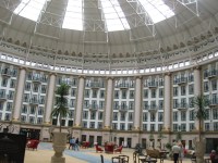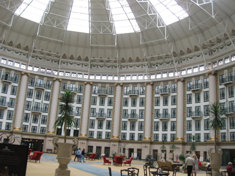 When we arrived at The Dome, we pulled up in a parking lot with tight spaces that all sloped severely right to left. Marilyn learned a moderately painful lesson in why a bike top heavy with packs and gear is hard to park on a slope which affects your ability to put your foot down on a solid surface. Yep, over she went. No serious harm done. Twisted ankle, a few bruises and relocated chrome. But we got her and the bike up and she soldiered on. I have to admit, The Dome was an interesting site and a good place to visit if you’re in the area. (For more information go to:West Baden Springs Hotel