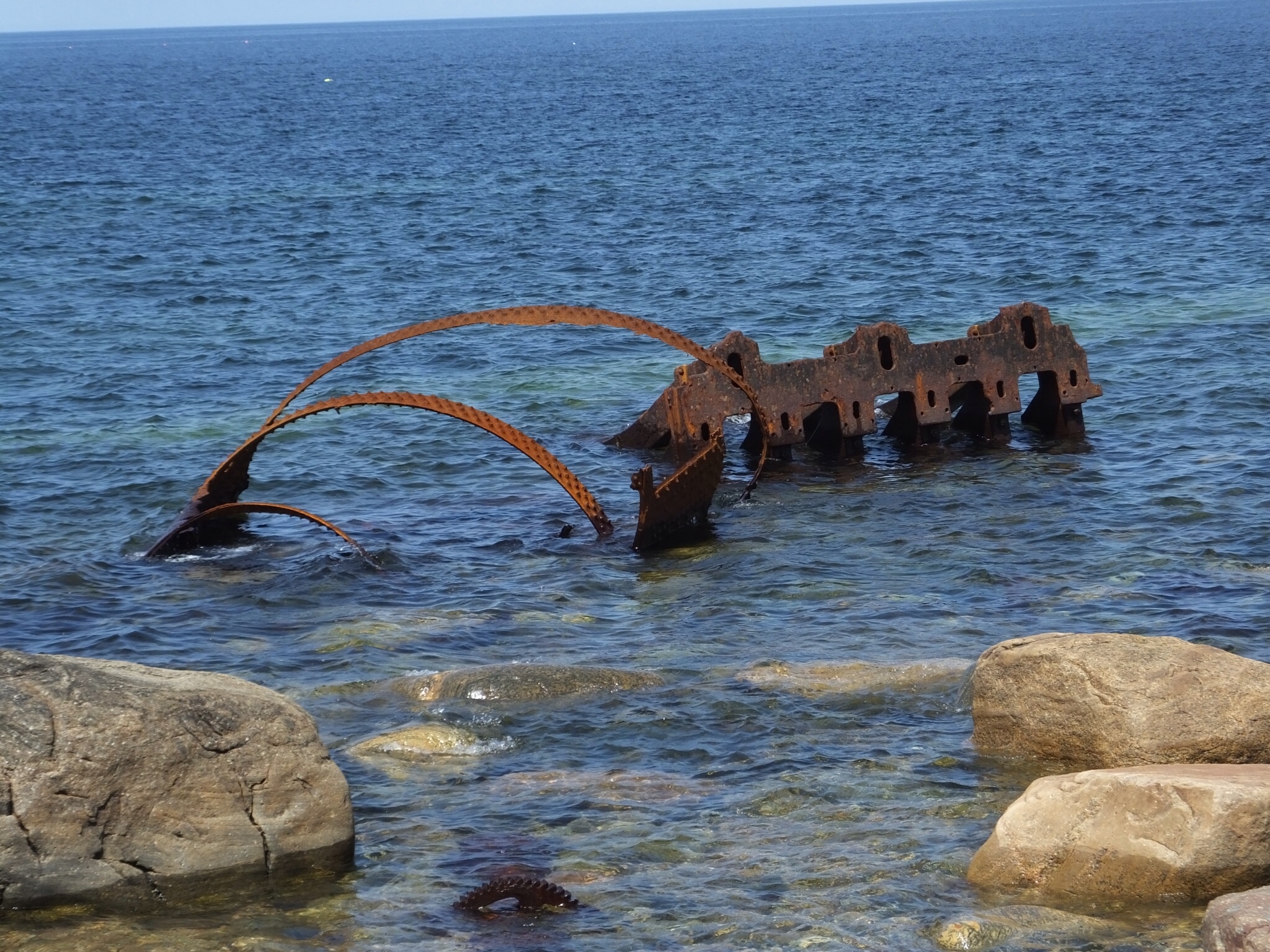 Once my Cow Head chores were done, I went south again to have a look around at some of things I missed while I imperiled my aging bones yesterday in the mountains. Before I got as far south as I was going to go today, I made a brief stop at the site of a 1919 ship wreck that could have been disastrous but, as it turned out, all 96 people aboard were rescued from the SS Ethie in a driving winter gale. The ship was done for, though, and its rusted remains still lie scattered like the bones of some strange sea creature on the beach. In this area, the Wreck of the Ethie is part of the heroic folk lore of the dangers of the sea and the bravery of those who sail it.
