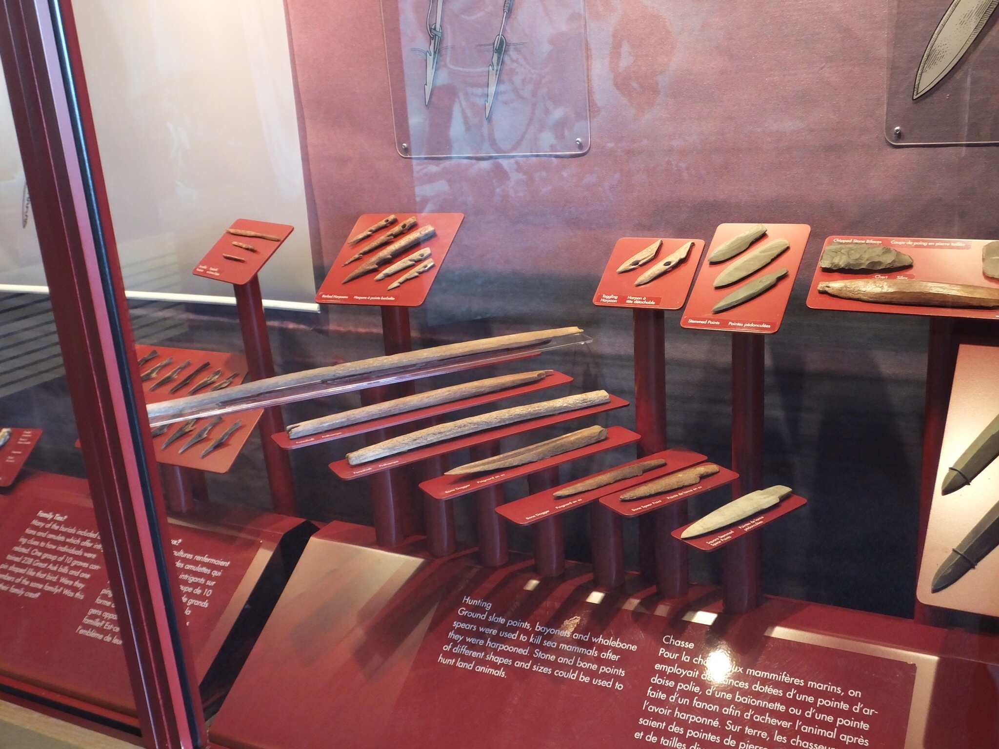 By the time Europeans arrived, all that remained were their buried remains and thousands of artifacts (spelled “artefacts” in Canada, I noticed) that range from cleverly designed fish hooks to meticulously created spear points to lamps and pots carved from solid sandstone. We often think of these people as “primitive,” yet if left to our own resources could we develop the same tools before we perished of cold or hunger? They migrated hundreds of miles over the course of each year and kept alive their cultures for millennia. Quite a feat.