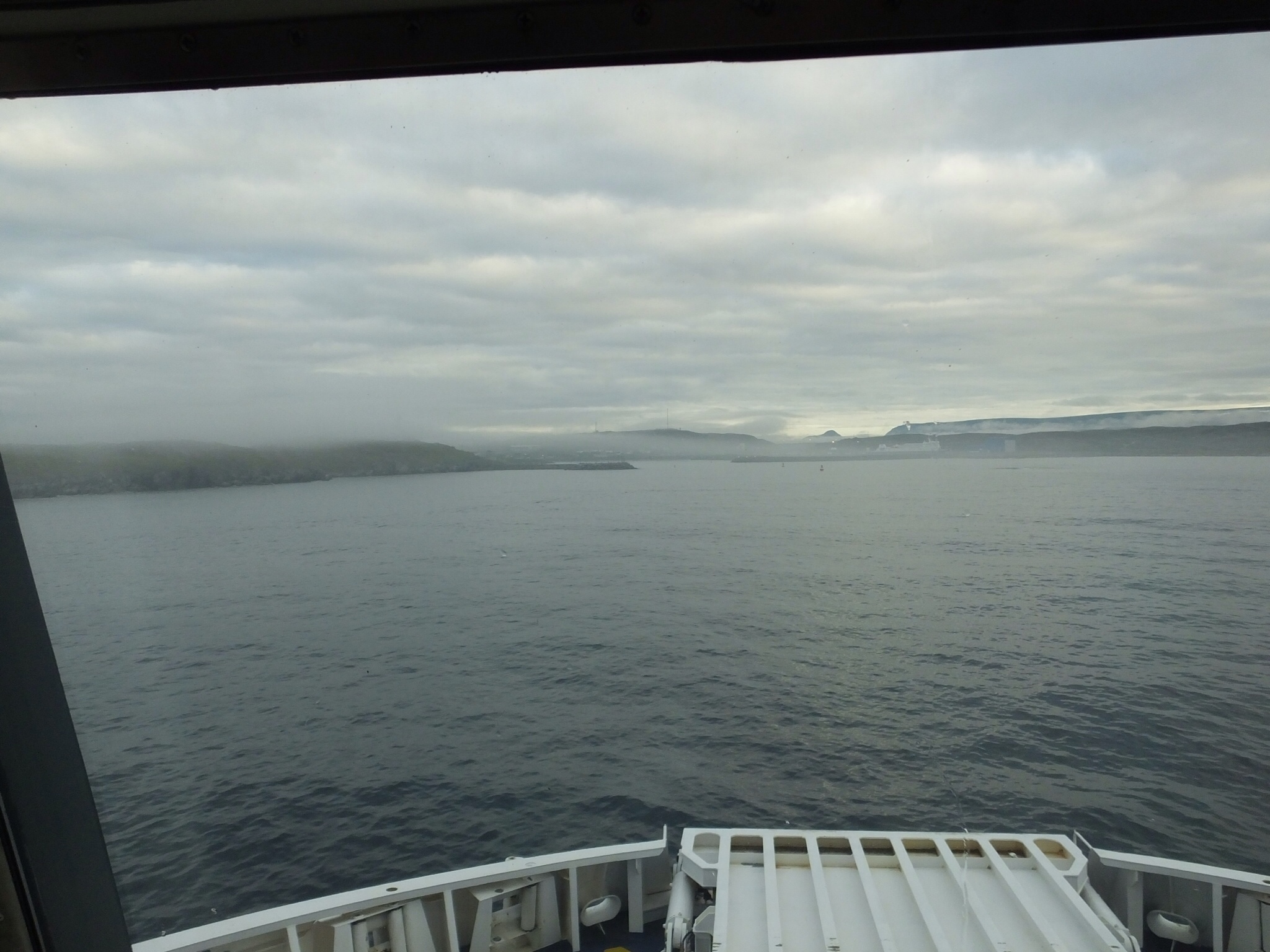 The ferry had three decks for vehicles and probably room for about 700 people though I heard one of the crew members say there were about 375 passengers on board. Lots of commercial trucks and campers and five other bikes besides mine. By the time I got loaded, tied the bike down, found my reclining chair and settled down it was after midnight. Then at five I woke up to the sound of the ship’s foghorn being sounded about every 3-4 minutes as we neared the coast of Newfoundland in a fog.