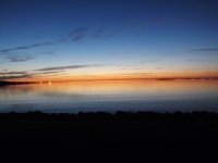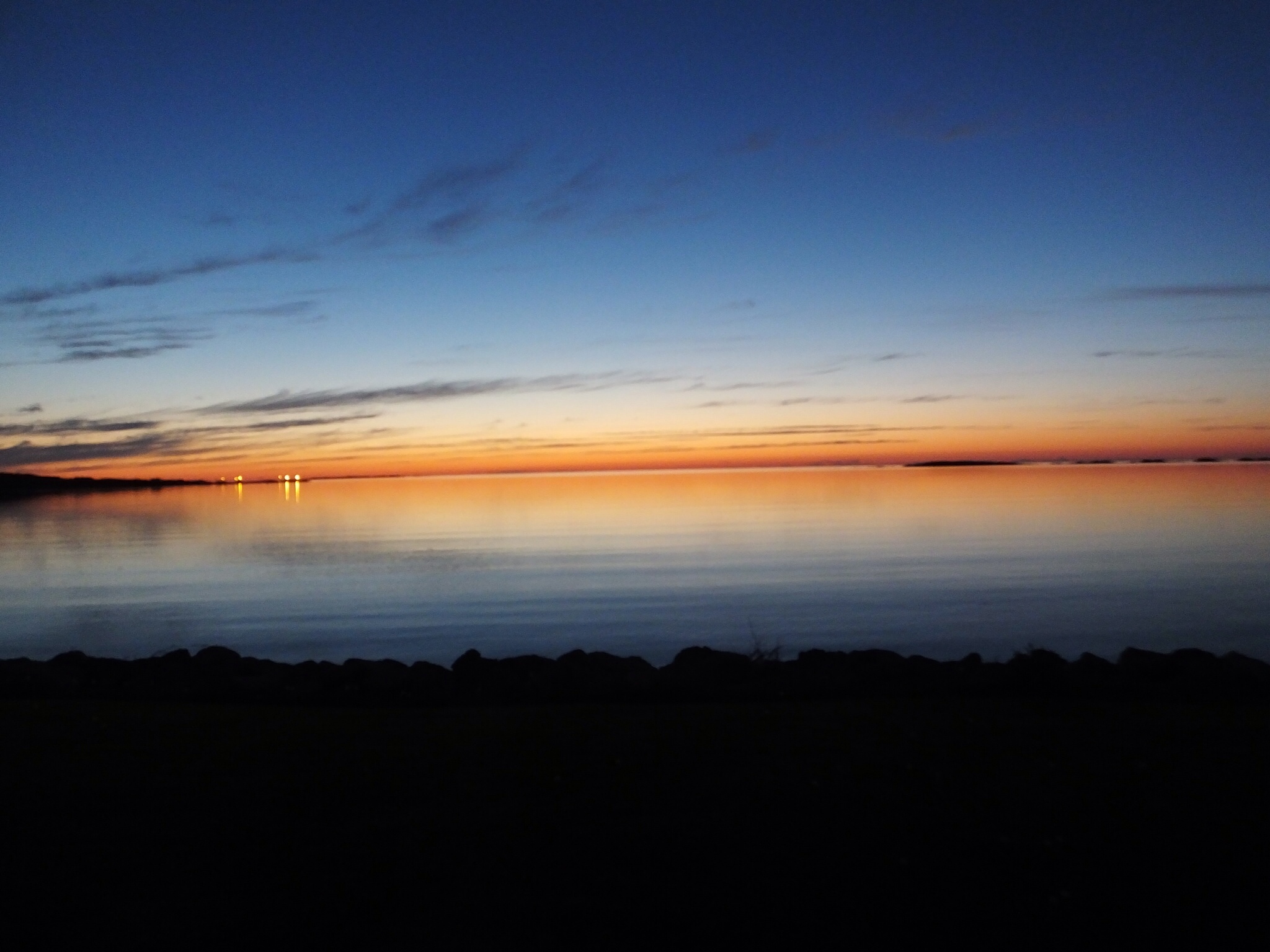 After five hours of sleep in a recliner not nearly as comfortable as the one I sleep in at home, then eight hours on the road to get here, plus two hours at the theater, I’m beat. I must be getting old. I can’t seem to handle 18-hour days like I used to. So I’ll sign off and leave you with a picture of the 10:30 sunset I enjoyed from the porch just off my room at the Bay View B&B following the play.