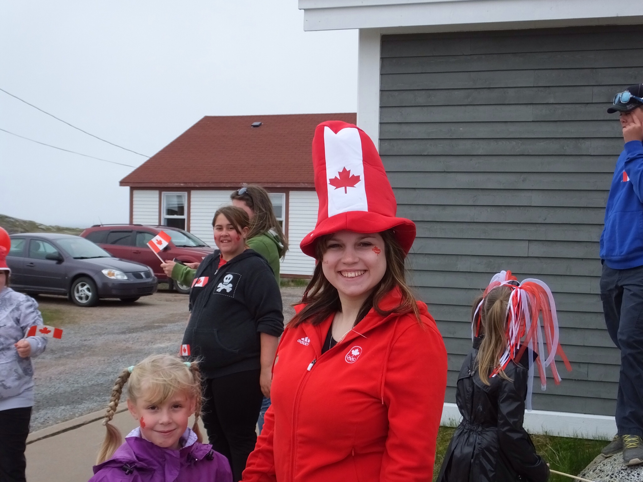 As a bonus to my trip to the Historic Site, I watched and even participated in the annual Red Bay Canada Day Parade and Celebration. Up the road came the firetruck (a chevy pickup) with lights flashing, followed by four boys on bicycles, a dozen or more eager children waving small Canadian flags and wearing Canada Day Hats and streamers in their hair, and their parents bringing up the rear in a headlight-glaring automobile procession. Once the parade reached the site, the head ranger lowered the red and white Maple Leaf ensign, then raised it again as the gathered revelers sang O Canada, then everyone moved inside to sing Happy Birthday to their native land and eat a cake decorated with a strawberry maple leaf. A good time was had by all, including me.