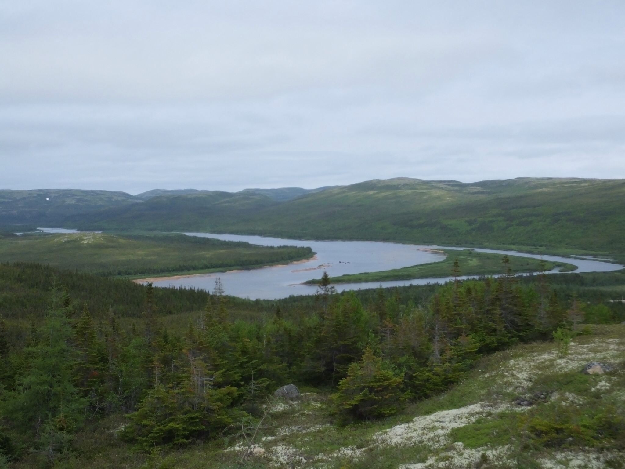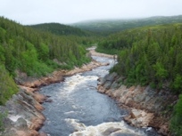I paused briefly along the way at the beautiful Pinware River, where a substantial number of frustrated fishermen had determined again today that the Atlantic Salmon had still not started making their way upriver. There was not a line in the water but they were properly attired in their waders, netted hats, and plaid shirts just in case their aquatic prey began their upstream swim. Since they probably fish all the time in waters like these, they may have been immune to the scene that riveted my attention. Fast water coursing whitely over boulders stretching through multi-green colored trees to the distant mountains like a liquid snake kept me staring for sometime, wondering why the fishermen didn’t just sit a spell and take it all in with a deep, satisfied breath. Maybe they did after I left.