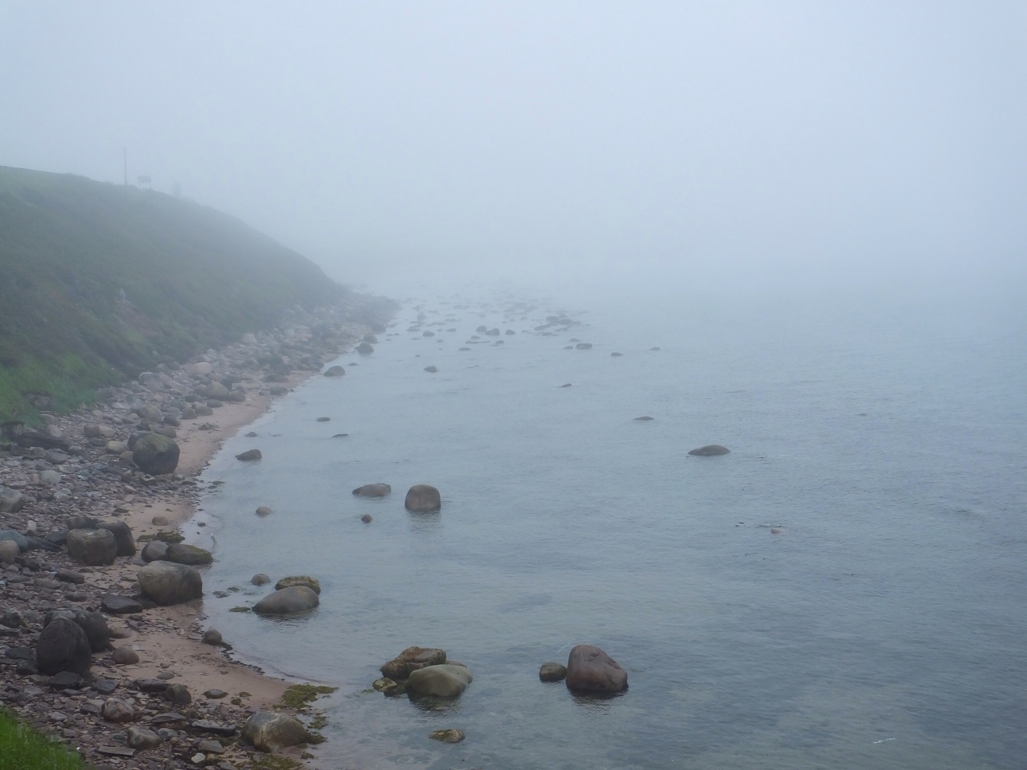 I woke this morning to fairly heavy rain and thick, hanging fog and 50 degrees, which meant I wouldn’t do the on-the-road sight seeing in Quebec I had planned. Instead, I suited up in rain and heated gear, said goodbye to my gracious host at the Genfell Louie A Hall Bed and Breakfast, and putted slowly through the forlorn mist to the ferry landing about 15 miles away at Blanc Sablon. There, I waited through the mizzel until the ferry arrived, disgorged its automotive load, and then swallowed up the cars, truck and lone, filthy motorcycle waiting in the que for their turn to enter the belly of the beast. The boat ride back to Newfoundland was considerably rougher than the ride to Quebec/Labrador two days earlier, though my vast nautical experience 45 years ago in the Naval service of our county served me well as I kept my breakfast where it belonged while others were losing theirs.