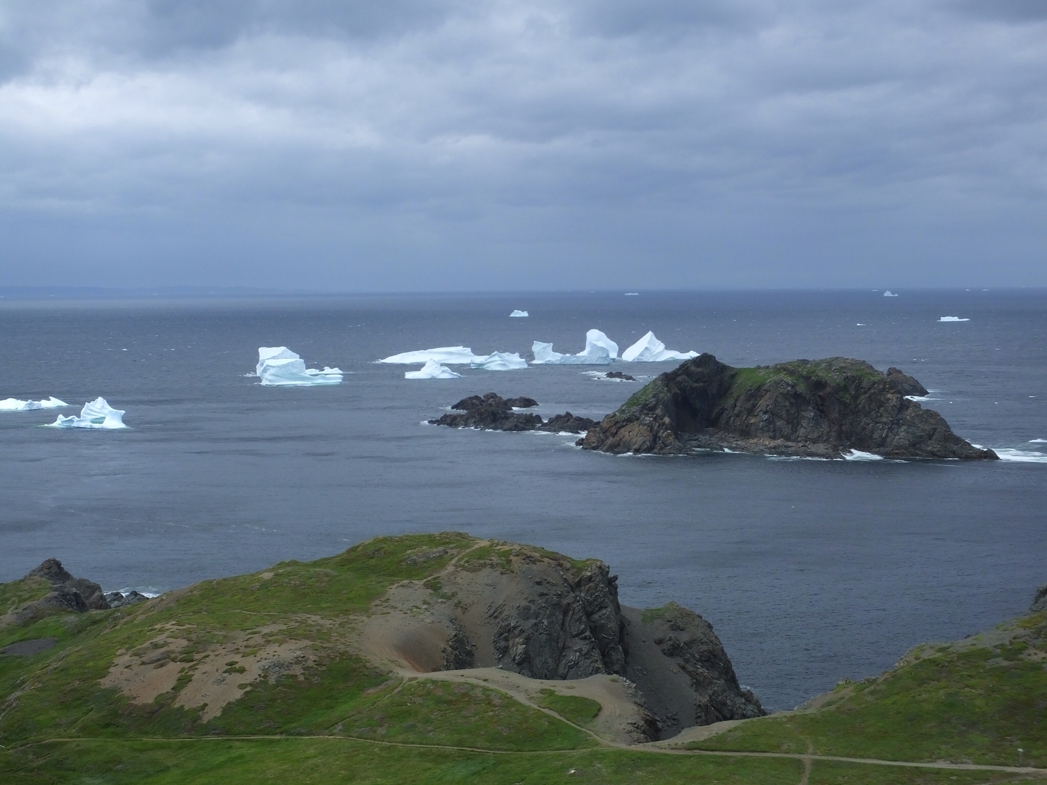 Other than kayaking yesterday, I had spent most of my Twillingate time in museums and at various entertainments and didn’t want to miss hiking along the rugged coastline. So this afternoon, I headed to the northern tip of the island where some trails had been laid out beginning at the top of the cliffs, winding their way through scrub trees on the gray, rocky soil and down to the rocky beaches (no Florida sand here). Once again, the sights along the precipitous cliffs–especially the icebergs–were awe inspiring and the exercise was good for body and soul. As I strolled down the cliffs and huffed-and-puffed my way back up again several times, I knew I wanted to come back here again.