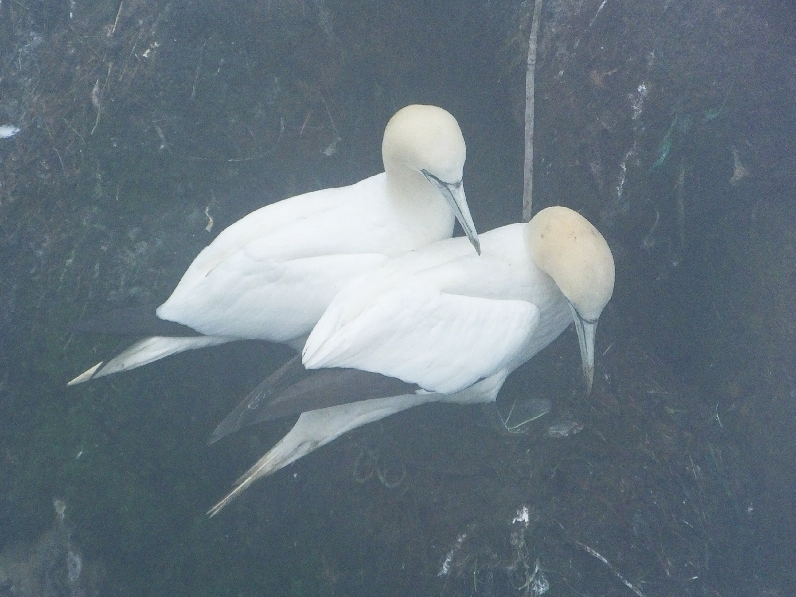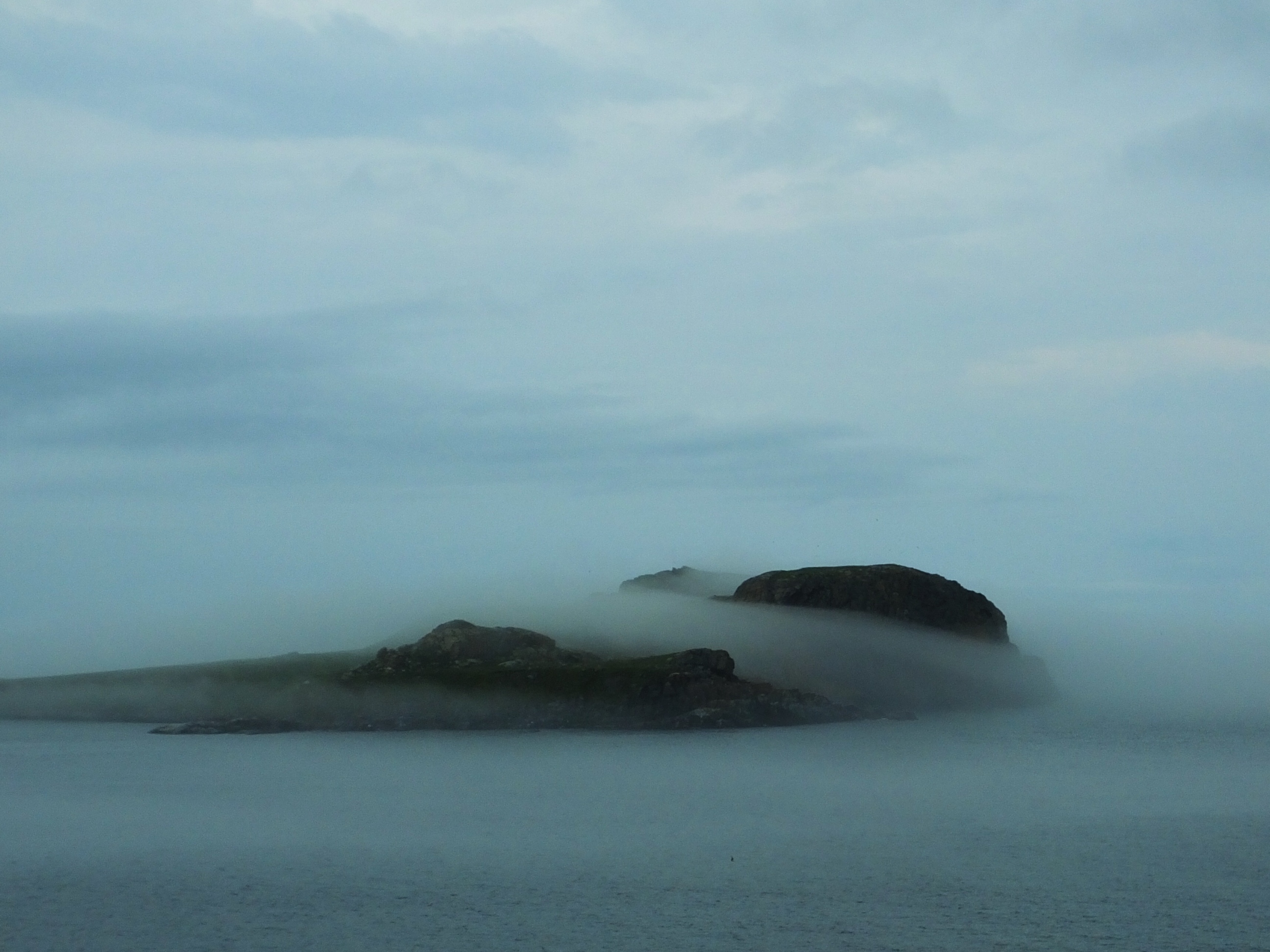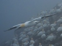 At the tip of Cape St. Mary (I think everything in Avalon is named for a Saint) is an ecological preserve that contains one of the largest collections of dozens of species of sea birds on the island, and the largest collection of one particular bird: The Gannet. The ranger at the visitor’s center assured me I would be able to see the birds through the grey fog that covered everything except the sound of the fog horn at the nearby lighthouse. So I hiked the mile-long, sheep-poop covered path along the 200 feet high cliffs (that had no fence or guardrail anywhere!) to Bird Rock. Oh yeah, I could see them. Thousands of them. Covering almost every inch of a large rock (small island?) next to the cliffs. The fog made taking pictures difficult but I managed to get a couple. I’m not a birder, but I have to admit seeing–and hearing–that many birds landing, sitting, taking off, soaring, chasing was pretty cool and the hour-and-a-half detour was worth the time.