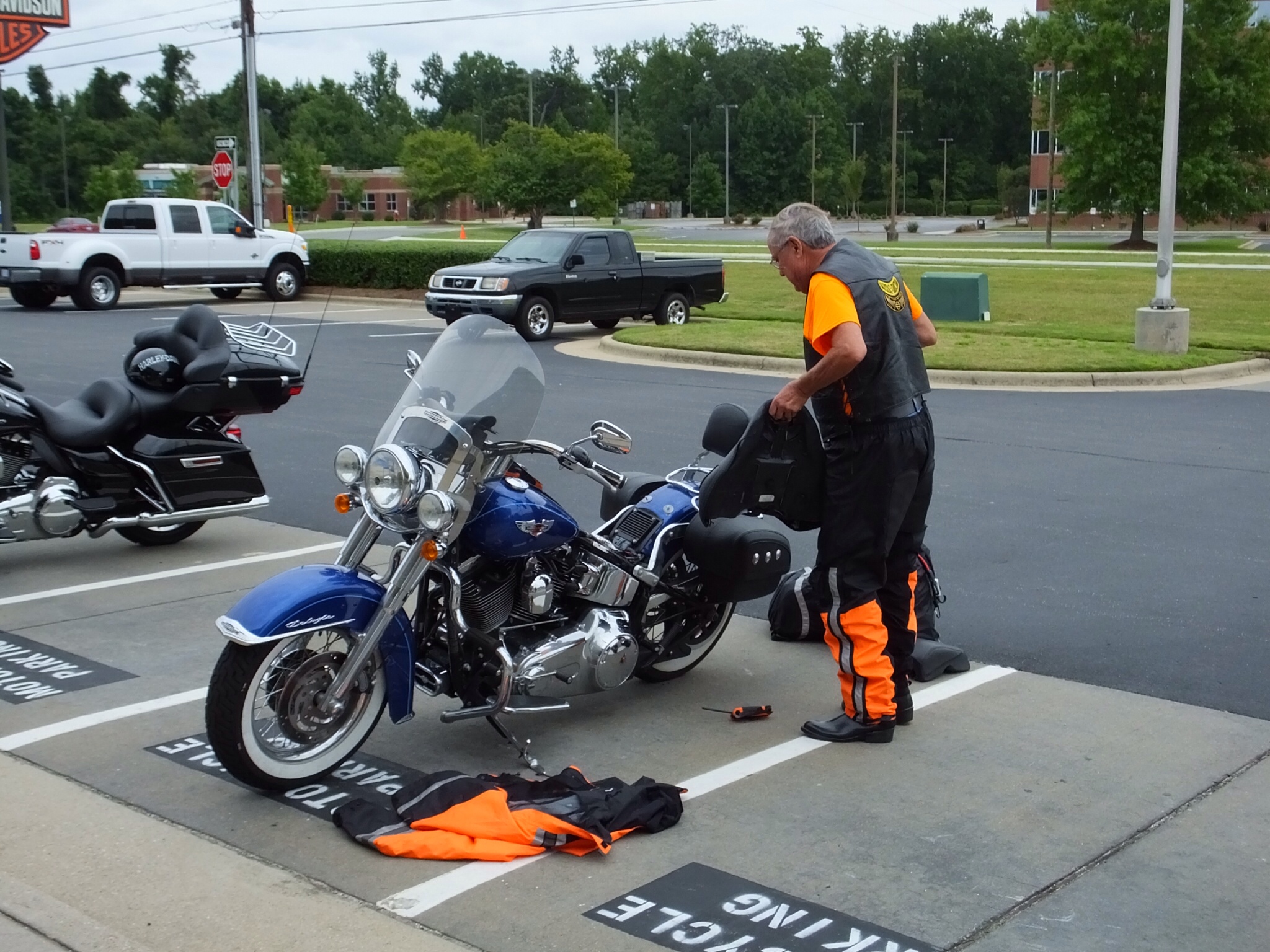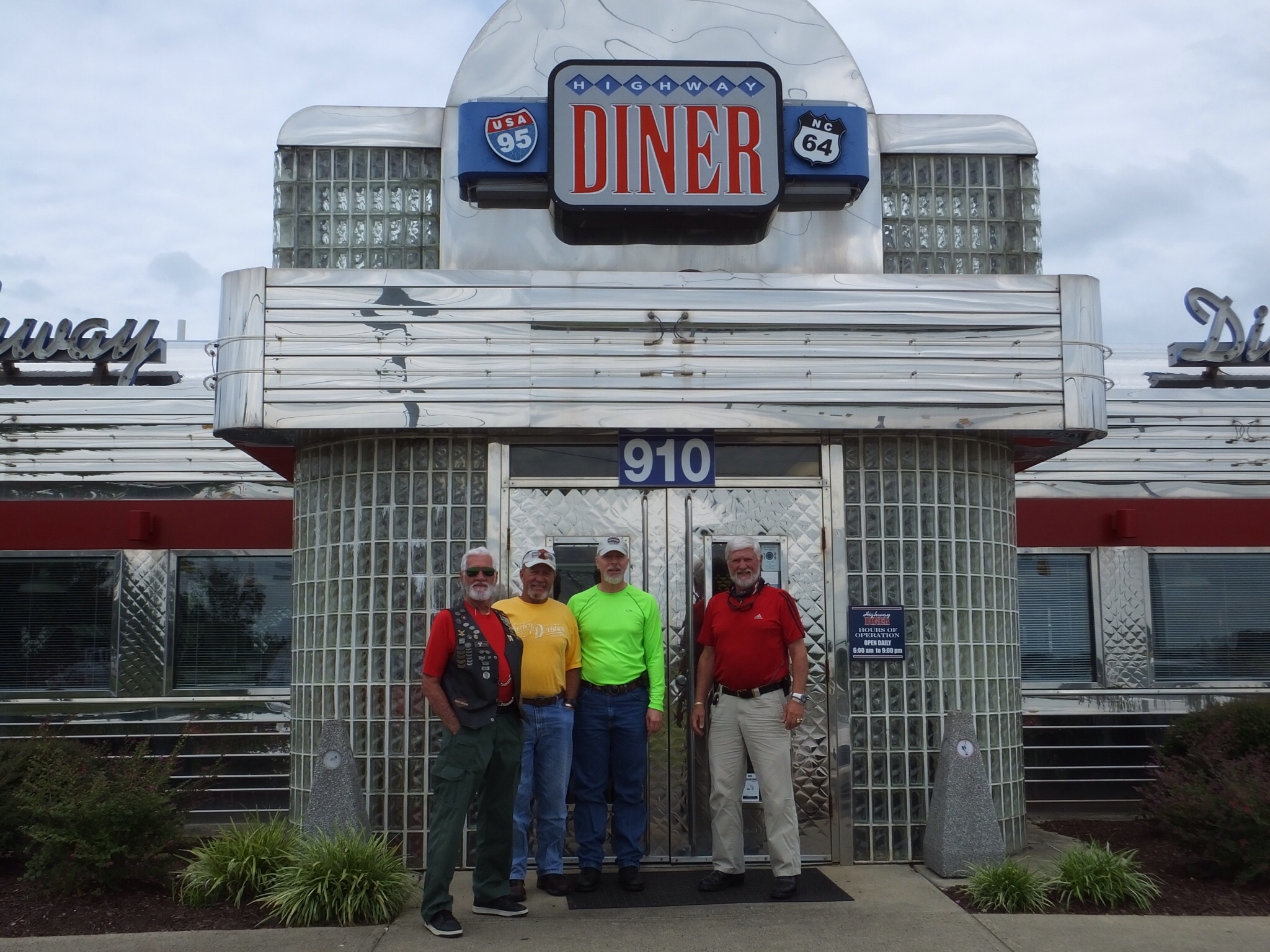 Jimmy Gardner discovered yesterday a continuing problem with an electrical drain on his battery resulting in difficult or non-responsive starting. So he decided to attack the problem by removing a thrice-repaired battery tender connection that seemed most likely to be the culprit. As luck (or brilliant planning?) would have it, lunch had been scheduled at a diner next to the Harley-Davidson dealer in Rocky Mount, NC, and he took the opportunity to borrow a couple of tools, remove the seat, unhook the battery, and remove the offending cable. That problem solved, he joined the rest of us for lunch at the Highway Diner.