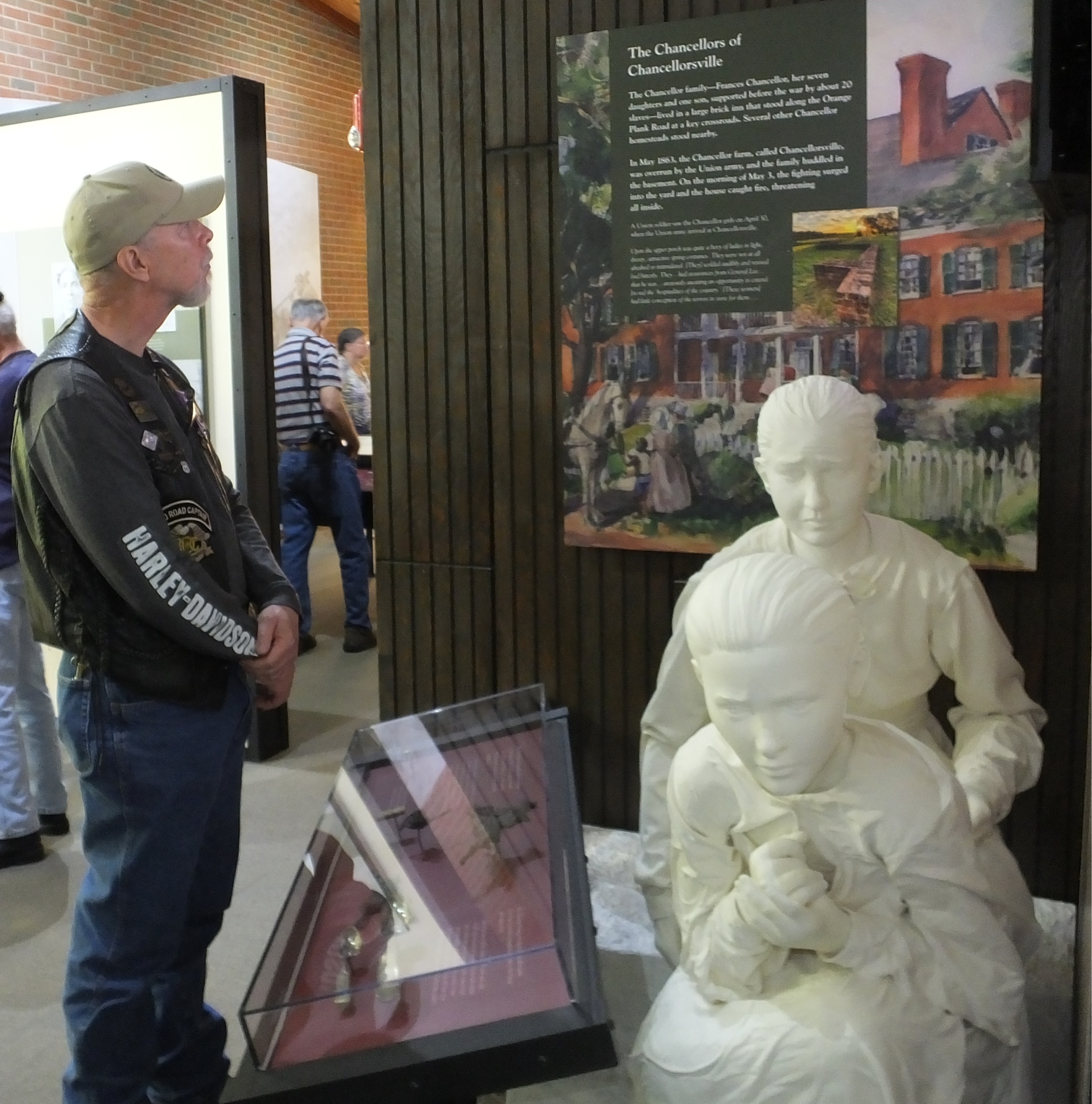 It seems no OPHOG Blue & Grey Campaign day would be complete without at least some bike problem and today’s winner was Ray, who when he tried to start his bike at the end our visit at Fredericksburg, heard only the sounds of silence. Turn the switch. No power. No cranking. Nothing. Nada. Zilch. Remove the left saddle bag and side cover. Check the fuses. All good. Replace the fuses. No change. Still nothing. Then Ski suggested we go by the book: Use the trouble shooting steps found in the owners manual. Was the bike locked before the problem started? Then re-lock the bike and unlock it again. Voila! Power and the beautiful sound of a Harley cranking and firing and the throaty purr of the mufflers. Put the bike back together and ride off to lunch and our next destination: Chancellorsville Battlefield Visitor Center.