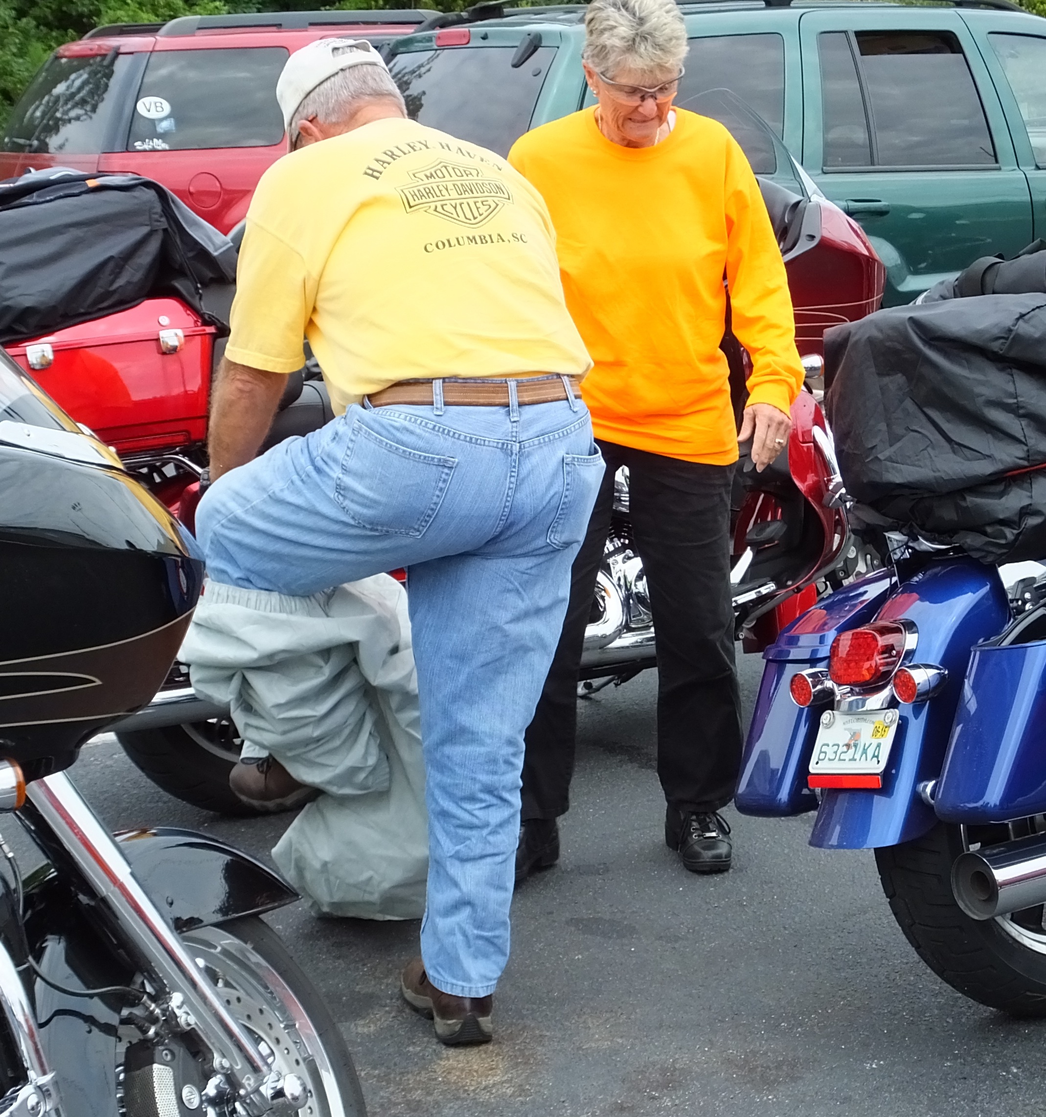 So, back to the bikes and ready for the road. Except Lee’s 2011 Road Glide wouldn’t start. Weak and dying battery. Original equipment. Time for a new one. Fortunately we were still parked next door to the Harley dealer. So seven of us proceeded to replace the battery. What would have taken one mechanic ten minutes to do, took the seven of us 30 minutes. Can you imagine: If the entire chapter had been available to help we’d probably still be there changing the battery.