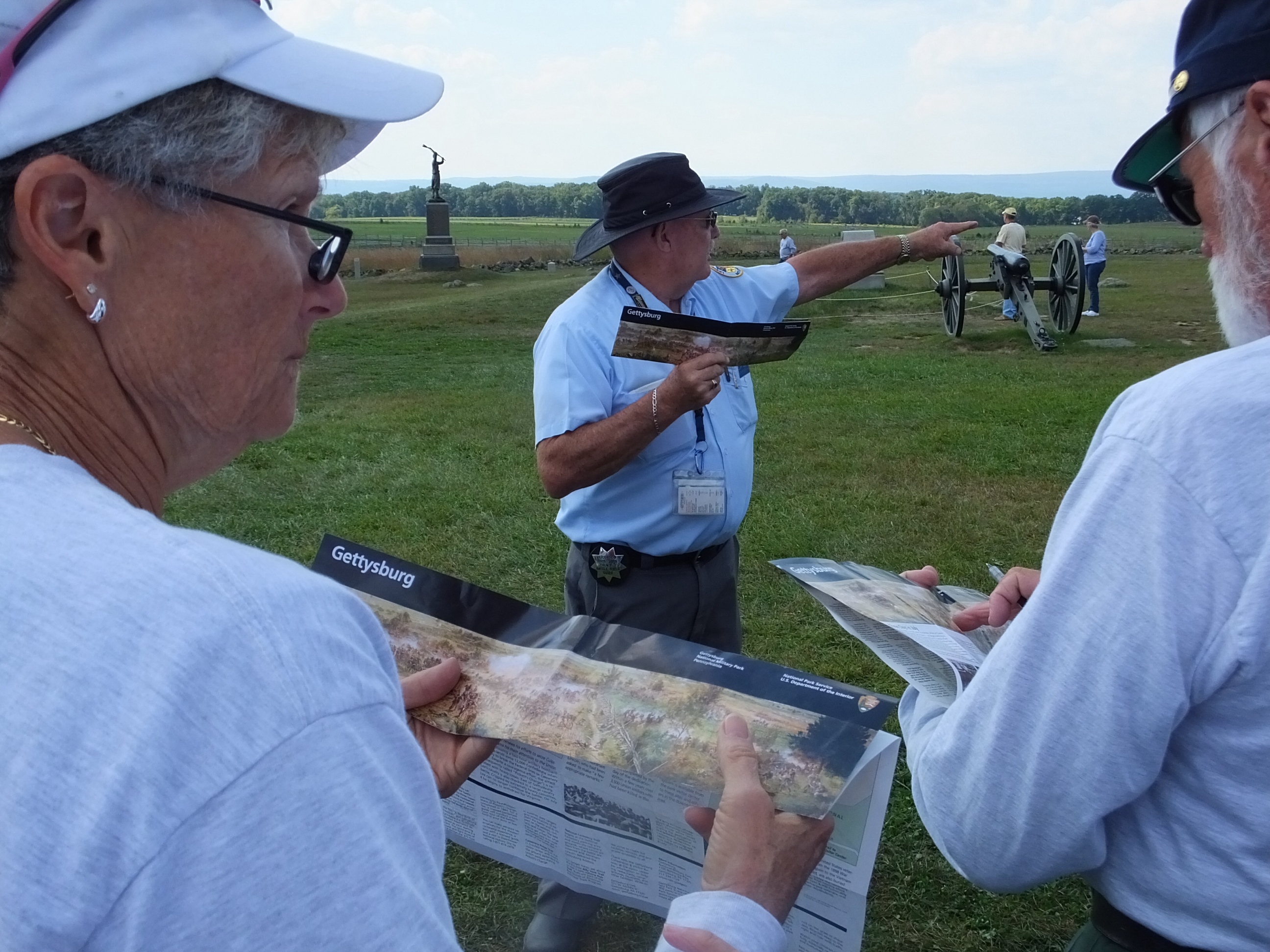 Thanks to a suggestion from Lee, we took a bus tour with a knowledgable guide in the afternoon rather than ride the self-guided auto (motorcycle) tour. It was a good suggestion, in part because we had an articulate, licensed guide who, in addition to delivering an informative narrative, also expertly fielded all the questions we could throw at him during the two-hour tour around the 4,000 acre park. The expert guide covered the chronology of troop movements, the effort to restore the battlefield to its 1863 appearance, and the important points on the field where the most vigorous fighting occurred: The railroad cut on Day 1; the peach orchard, wheat field, Devil’s Den, and Little Round Top on Day 2; and the famous Pickett’s Charge across an open field and up Cemetery Ridge that marked the end of the battle and the High Water Mark for the Confederacy on Day 3.
