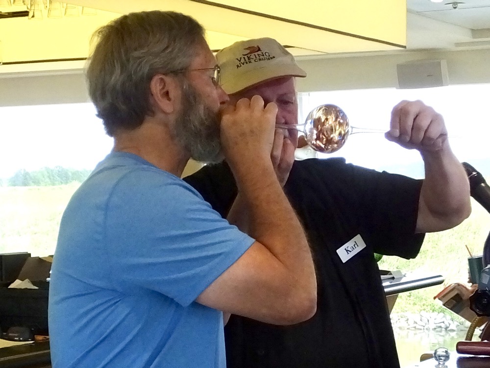 While we cruised on the Main River to our next port of call–Bamberg–in Franconia/Bavaria/Germany, Carl the Viking River Cruise Program Director thought we should have the opportunity to be entertained if we wanted to do something other than watch the river. So he brought aboard a sixth-generation glass blower from Wertheim, a small town near Miltenberg, who happens to be one of the best glass artists in the world, to give a demonstration of his art. In the course of his demonstration he asked for a volunteer to show how “easy” glass blowing is. Of course, I volunteered when the others in the ship’s lounge hesitated to step forward.
