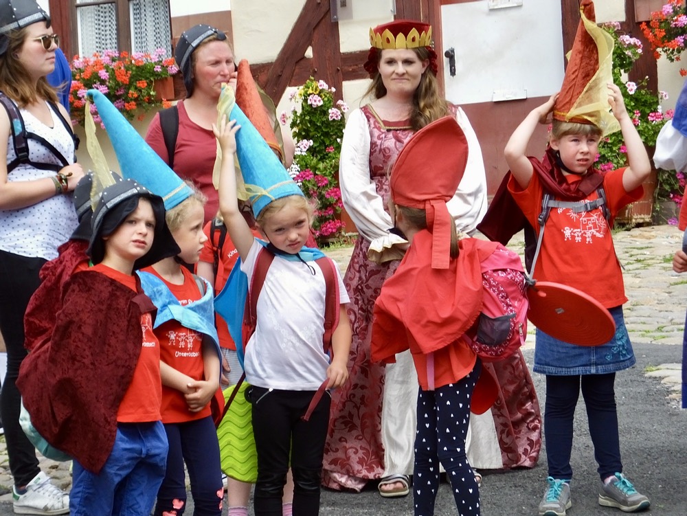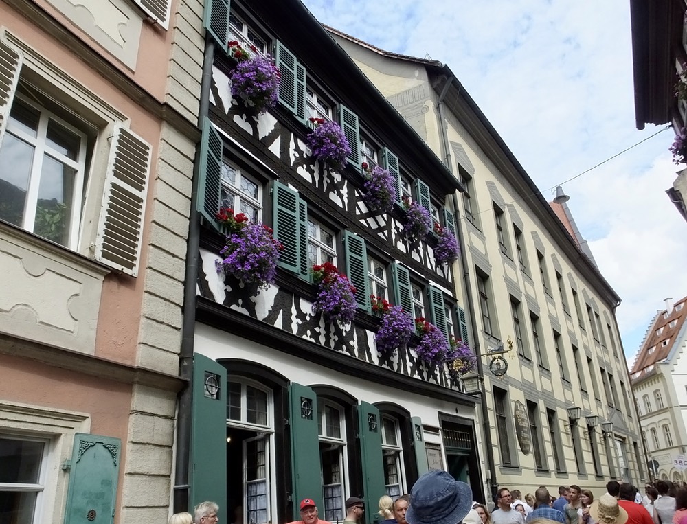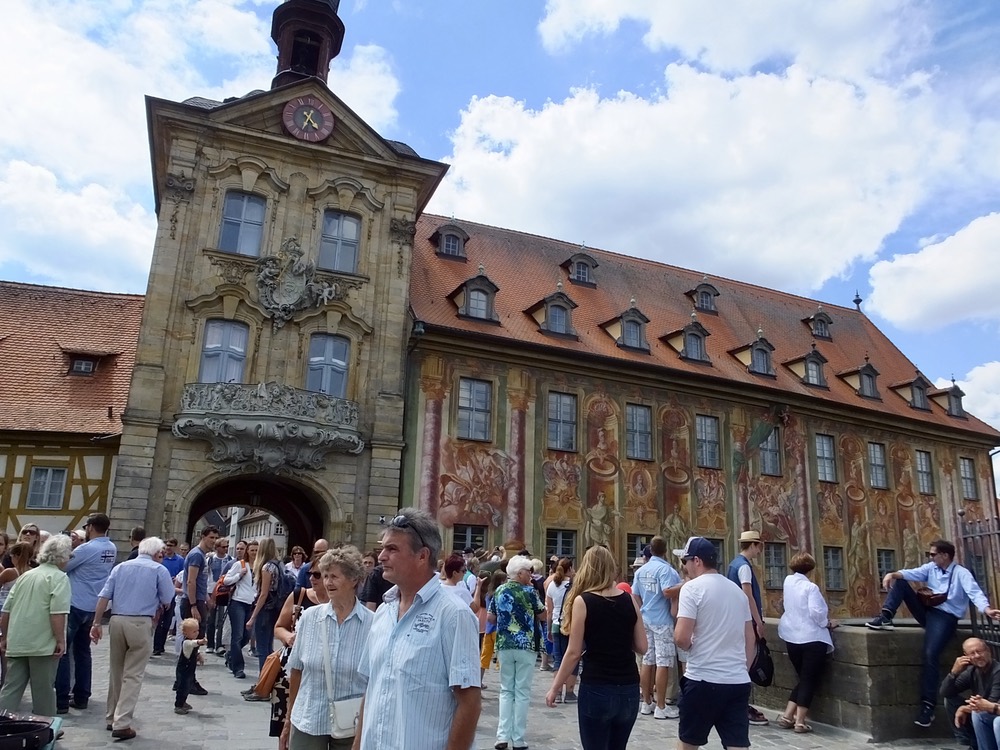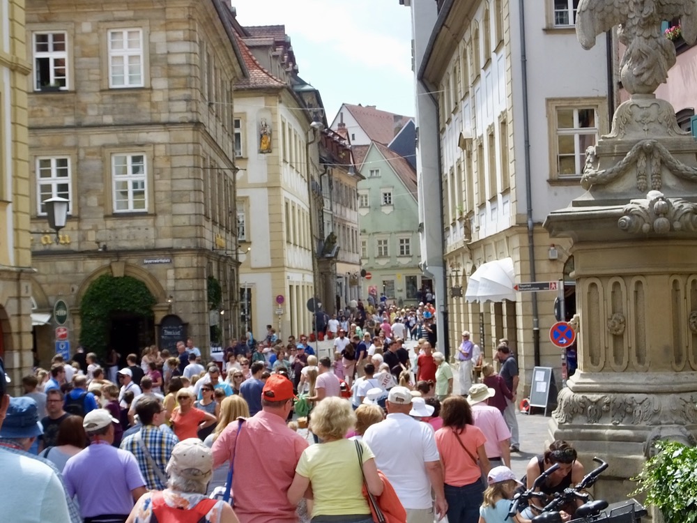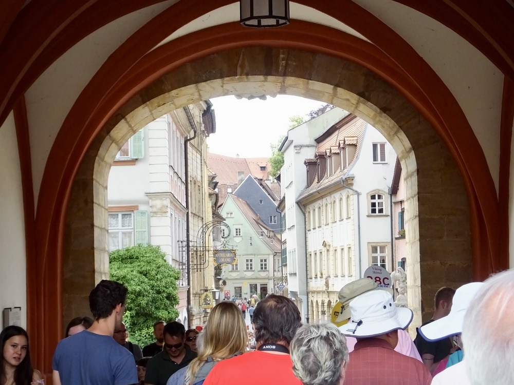 After docking in Bamberg and once again eating way too much at lunch, we headed into the city, another of the lucky towns to escape the wrath of allied bombers, leaving intact public buildings, shops and cathedrals that date back to the 11th century. Today happened to be a festival day and the city was crowded with festival goers and various magicians and other performers. Normally on Sunday, the city streets would have been relatively quiet and we wouldn’t have had to compete for sidewalk space with hordes of families and other celebrants. But it was nice to see how the populace enjoys themselves on a special day.