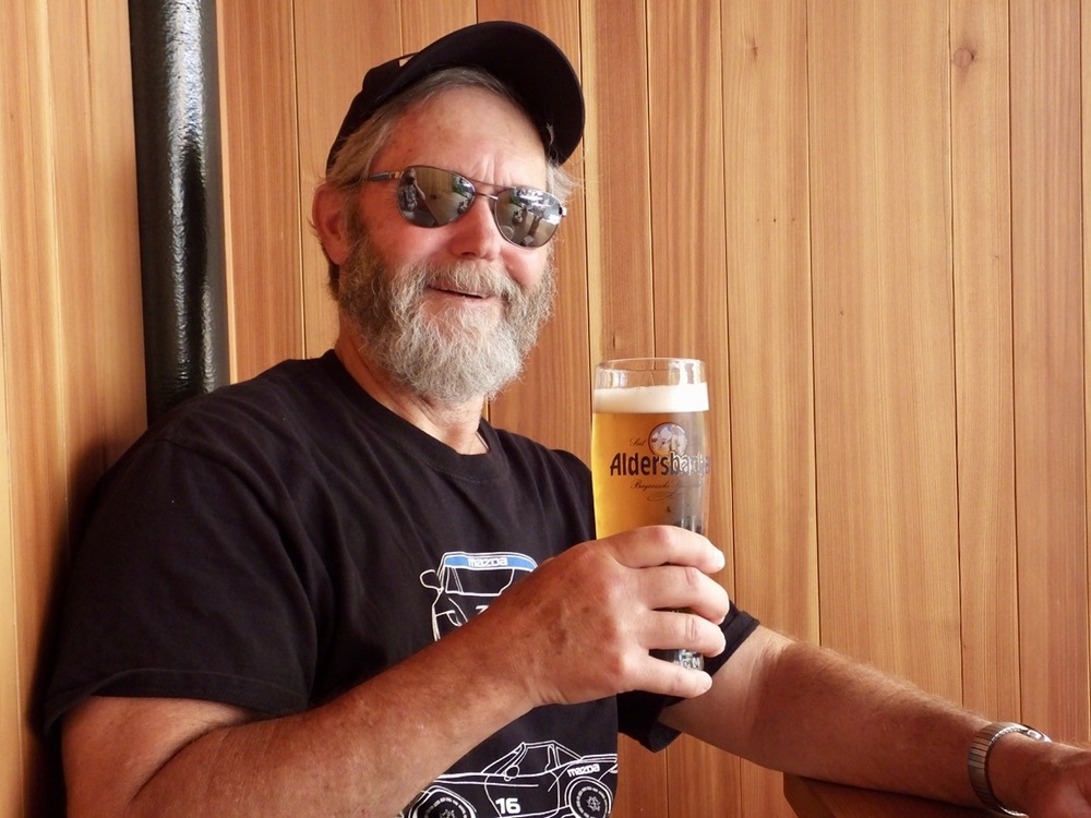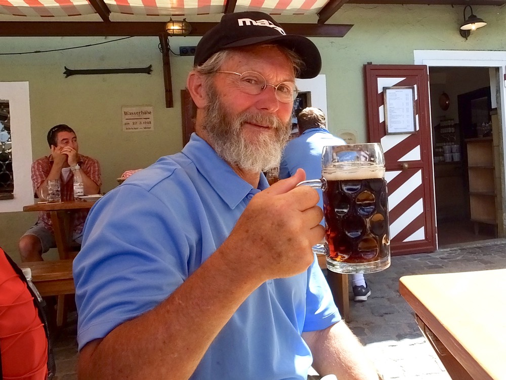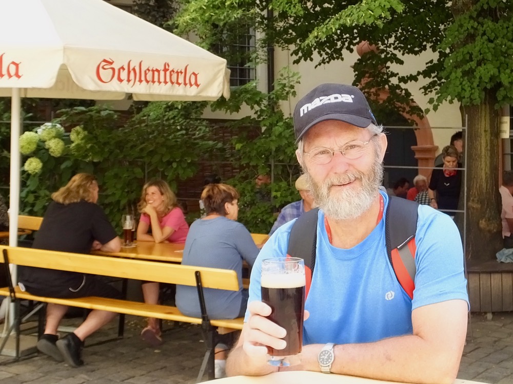 When the tour ended and we said auf weidershen to Alex, I set course for the Schlenkela brewpub to try the talk of the town: Rauchbier or smoked beer. By cooking malt over an open flame, Bamburg breweries impart a smoky, bacon-like flavor to their dark beer. We had been warned it wasn’t to everyone’s taste, but it definitely suited mine. Joining the locals, I went to the window inside the tavern, ordered ein rauchbier, put a deposit on my glass, and went outside to enjoy the sunny afternoon. The beer garden outside was nearly full, but we found a small table at which we could stand and watch Bambergians (?) drinking their smoke beer, eating saubraten and enjoying the day.
