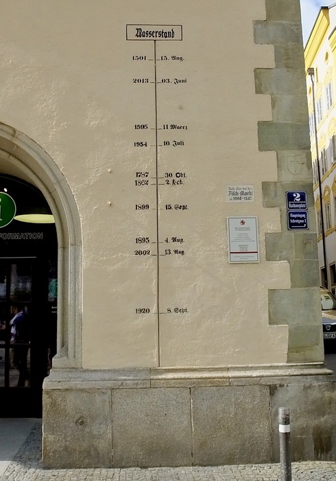 Our tour guide for the morning was Konrad, a professor of international relations at Passau University and a native of this town. He started our walk with a discussion of the city’s history, which can be traced to more than 7,000 years ago, thanks to its location at the confluence of three rivers: the blue Danube that originates in the Black Forest of Germany, the black Illz that originates in the Bohemian Forest of northern Germany and the green Inn that originates in the melting glaciers of Switzerland. The three rivers give the city much of its character, but they have also contributed to its unfortunate past, namely a series of devastating floods, the depth of which are documented on the photograph below. The most recent, and the second worst in history, occurred in June 2013 and reached the second story of all the buildings on the banks of the Danube and left behind more than three feet of mud when the waters receded.