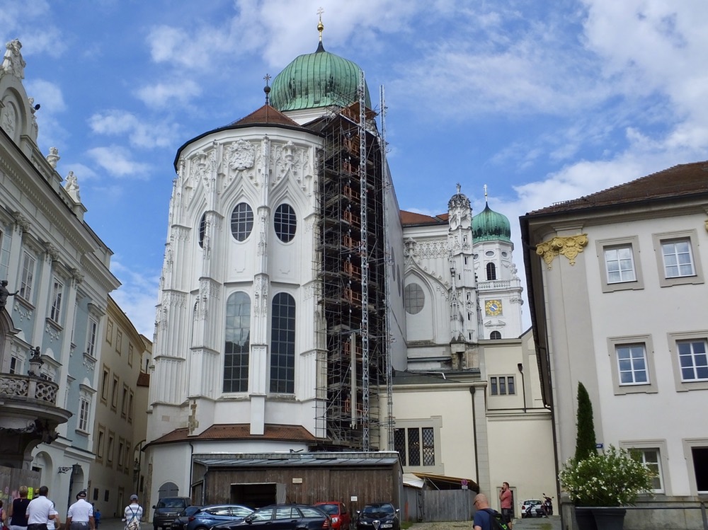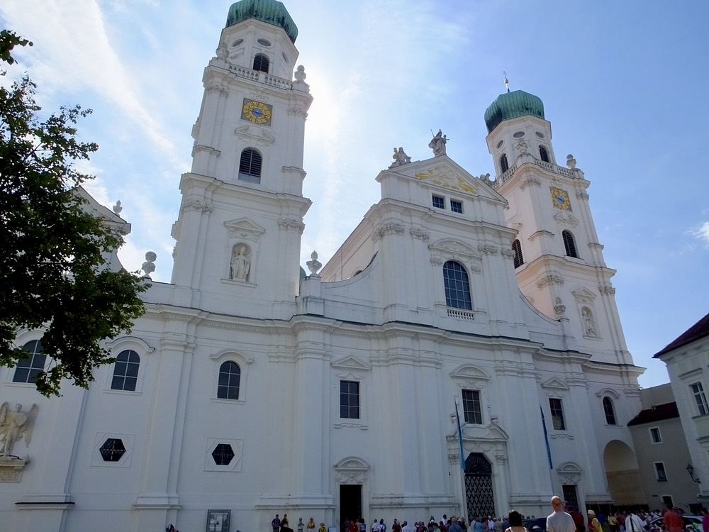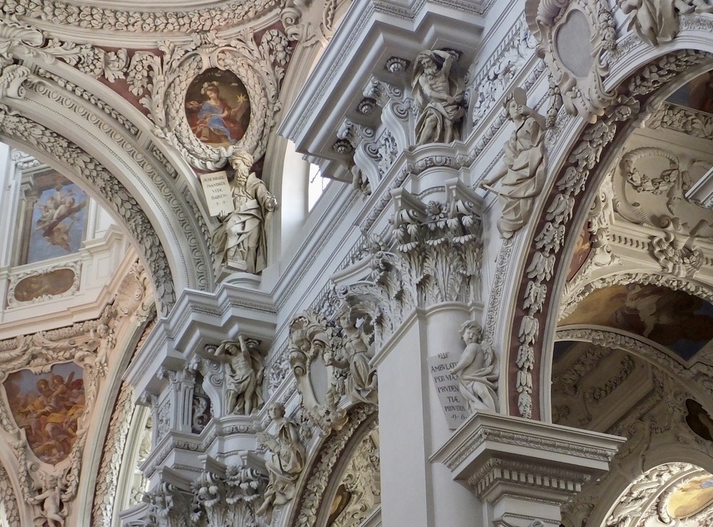 After pausing briefly on the banks of the Inn River and noting the milky color caused by the suspended sediment scraped and crushed from the sides of Swiss mountains by massive glaciers, we climbed the hill to town center and St. Stephens Cathedral. Unlike Gothic cathedrals we saw in other cities, Passau’s cathedral was different. The original Gothic structure, which had stood for hundreds of years, was destroyed by afire in 1683 that also destroyed or damaged much of the town. Italian baroque architects and craftsmen were hired to build a new church, a project that too more than a decade. The resulting edifice was very different from the older Gothic cathedrals that pepper the German landscape.
