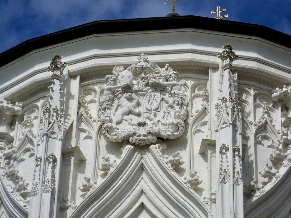 The rear of St. Stephens Cathedral with scaffolding that seems to be a permanent part of all German cathedrals. The photo that follows shows the intricate detail at the top of the tower. The attention to minutia at more than 200 feet in the air most people can’t really see is amazing.