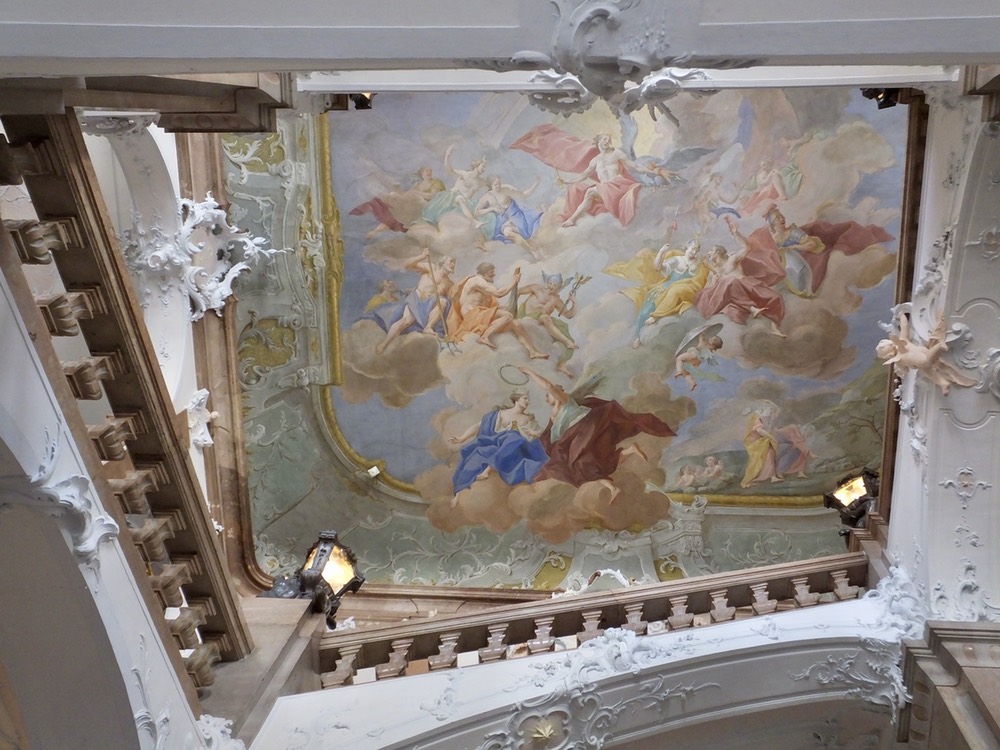 One other note: Near the end of World War II, Würzburg suffered the same fate as several other German cities, Dresden being the most well-known, which were fire bombed and almost completely destroyed. In the case of Wurzburg, about 90% of the city was destroyed in the incendiary induced firestorm, including much of the Residence. What remained was saved, in large part by Americans recently made famous by the movie “Monuments Men.” By 2000, the residence had been largely restored at a cost of €20 million proudly paid by German and Würzburg taxpayers, and subsidized in a way by the U.S. Marshall Plan.