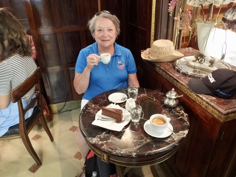 That meant another visit to another coffeehouse/bakery, this one recommended by our excellent guide Agnes (aka Aggi). Starbucks and even local coffee shops in the states just don’t have the atmosphere of these small coffeehouses that have histories, including recipes for their various cakes, pastries and chocolates, going back hundreds of years. Today’s cake to go with my cappuccino and Marilyn’s coffee Americano was made with the same recipe the same shop developed more than 200 years ago. It was easy to see, after only one delicious bite, why the recipe was a keeper.