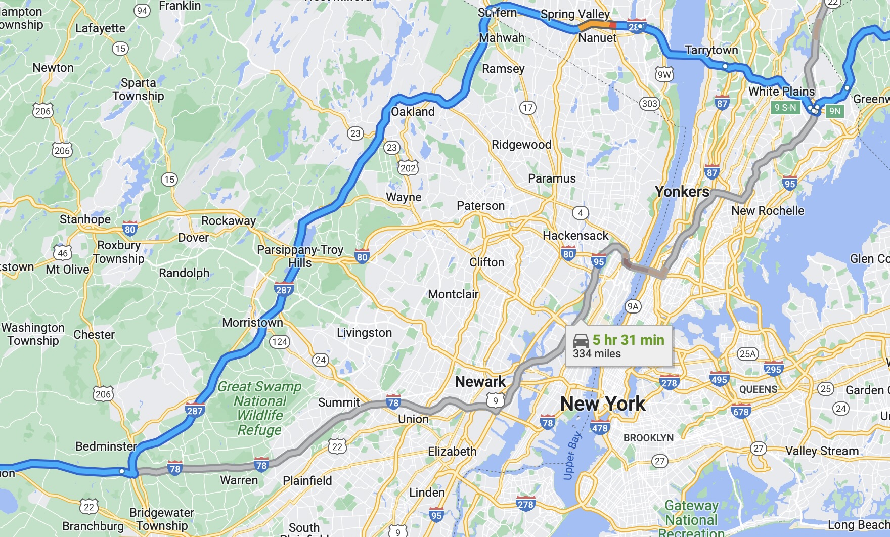 Google Maps apparently thinks it knows what I want better than I do and decided to show me a shorter route, almost into the heart of NYC. On the map image below, the BLUE line is the route I wanted to go. The GRAY line is the route Google Maps imperiously decided we should take instead.