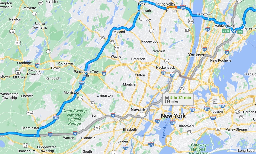 I routed the ride on the Google Map GPS using a round-about track that kept us well west and north of Newark and New York City. It was a few miles longer, but avoided whatever city traffic would be out on a Sunday holiday weekend and had fewer tolls. I didn’t really need to see the NYC skyline, which I’ld seen before on a ride that took me through downtown NYC.