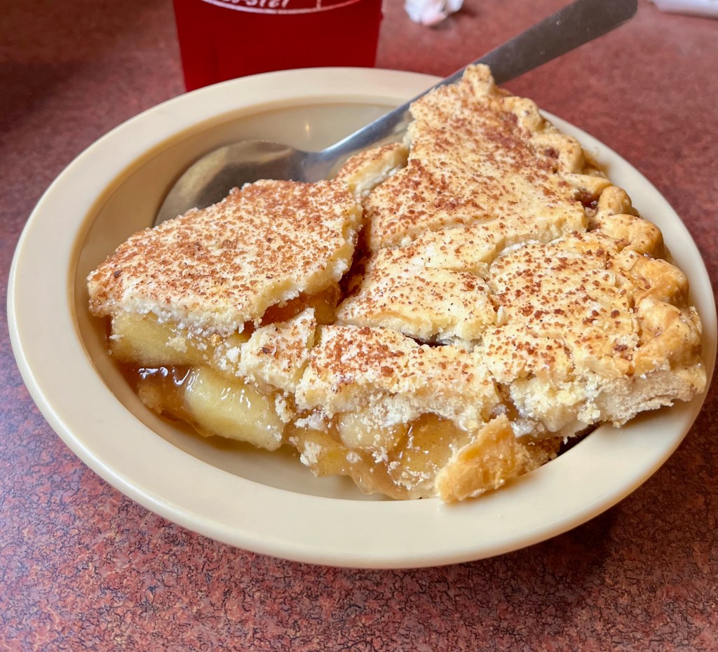 There are readers who come to hdriderblog.com not to learn of my adventures or to be enlightened about the fascinating places I visit, but, rather, to discover what kind of pie I had each day. For those not familiar with the pie saga, I spent several rides, it seems, living largely on pies of as many varieties as I could find. I still like pie. I still plan to eat pie on this trip. But at the risk of offending pie-crazed followers of the blog, I’m probably not going to make it a daily habit this time. It’s getting harder and harder to keep the pounds off, especially if all I’m doing is sitting on a motorcycle. Nevertheless, at Grayson’s Restaurant in Wytheville, Virginia, I ordered apple pie for desert, which I ate before I ate the outstanding cheeseburger I also ordered. Here it is: