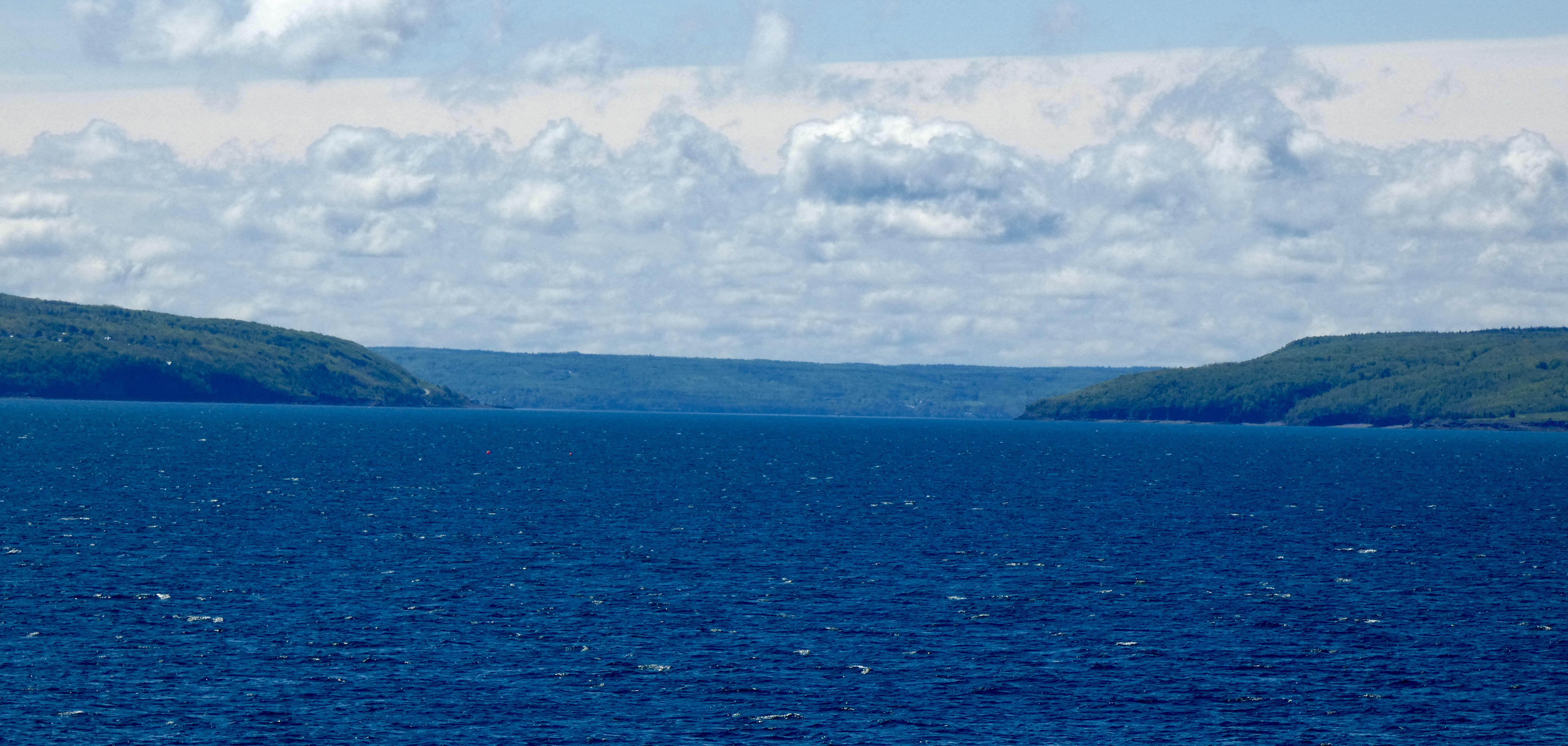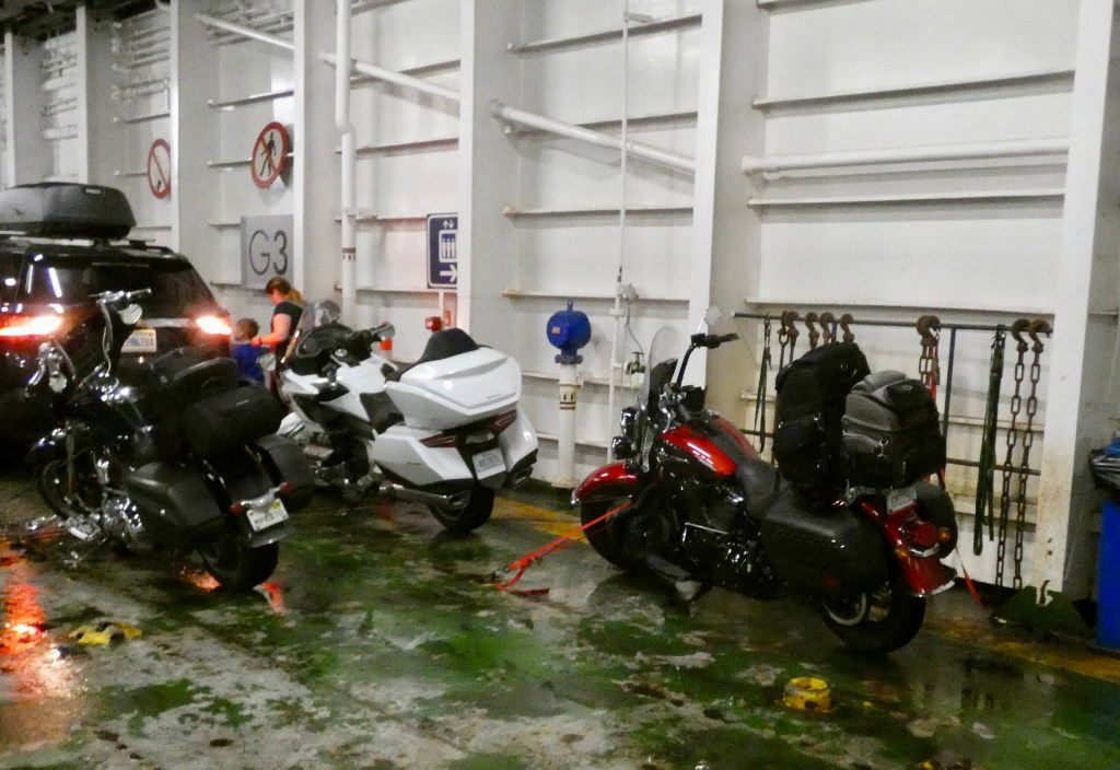 When I got up early to make sure we got to the ferry landing on time, I discovered it rained last night and was still lightly raining as we packed the bikes and got ready to leave. We suited up for the first (but not last) time this trip, and made the slightly damp 15-minute ride to the catch the Fundy Rose for a 2 1/2 hour ride across the Bay of Fundy. We arrived in plenty of time and joined the queue of cars, trucks and one other motorcycle waiting to load. At precisely 9:00 a.m, all vehicles had been loaded, the motorcycles were strapped to the steel deck and we pulled away from the dock in St John and said goodbye (for now) to New Brunswick.