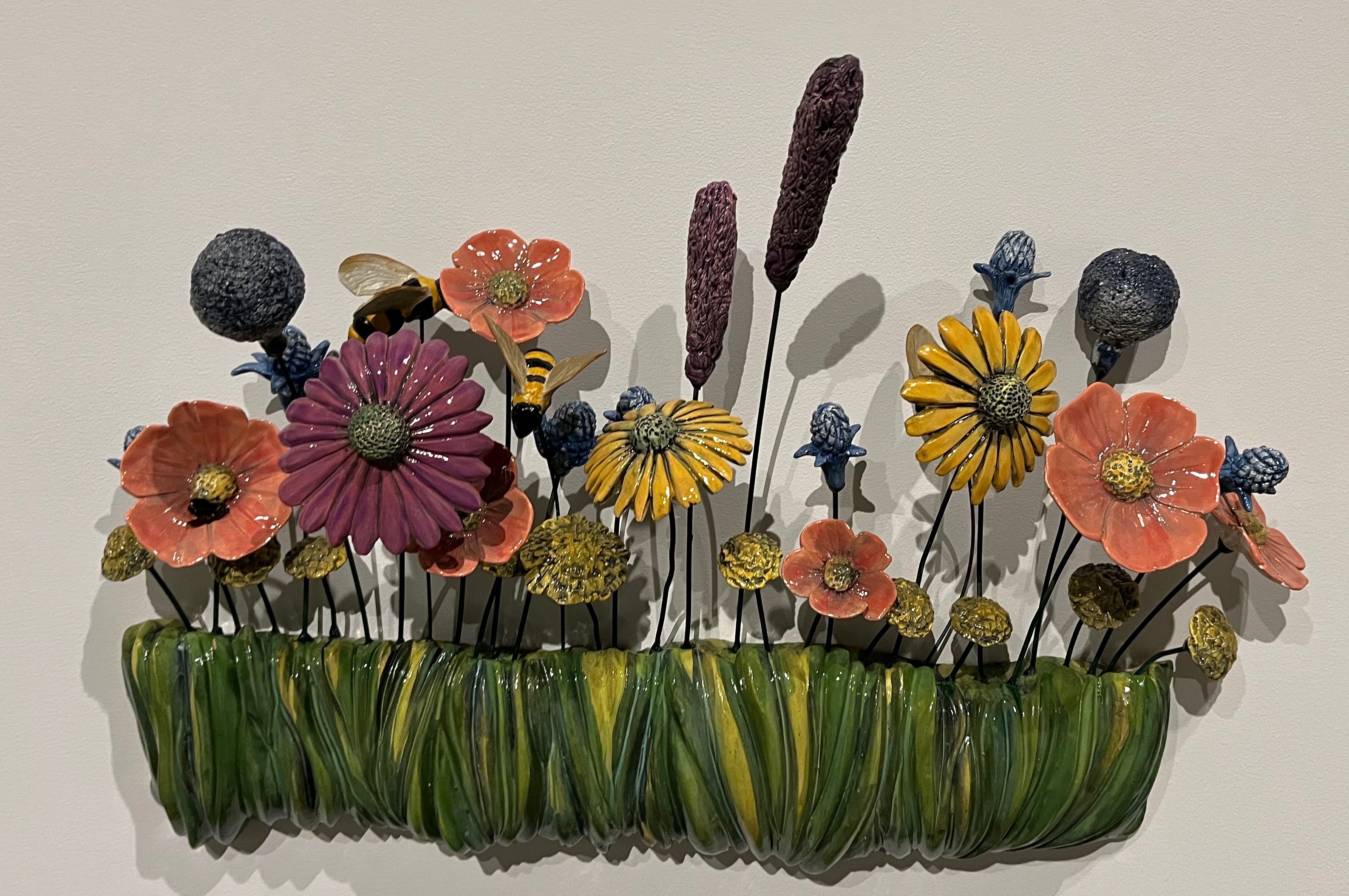 The second art exhibit featured a now-local artist, Dawn Detarando, born and schooled in Massachusetts and at the University of Wisconsin, who focused on the bees that pollinate plants on the land where she and her husband live outside Red Deer. What she noticed long before she started her sculpture project (which included about 30 items) was that bees were stressed by pesticides and herbicides widely used on lawns and on crops and by wild weather swings. Working with clay, wire and paint, she showed how science and climate change are affecting the ability of all species of bees to do what they do best: pollinate flowers and other plants.