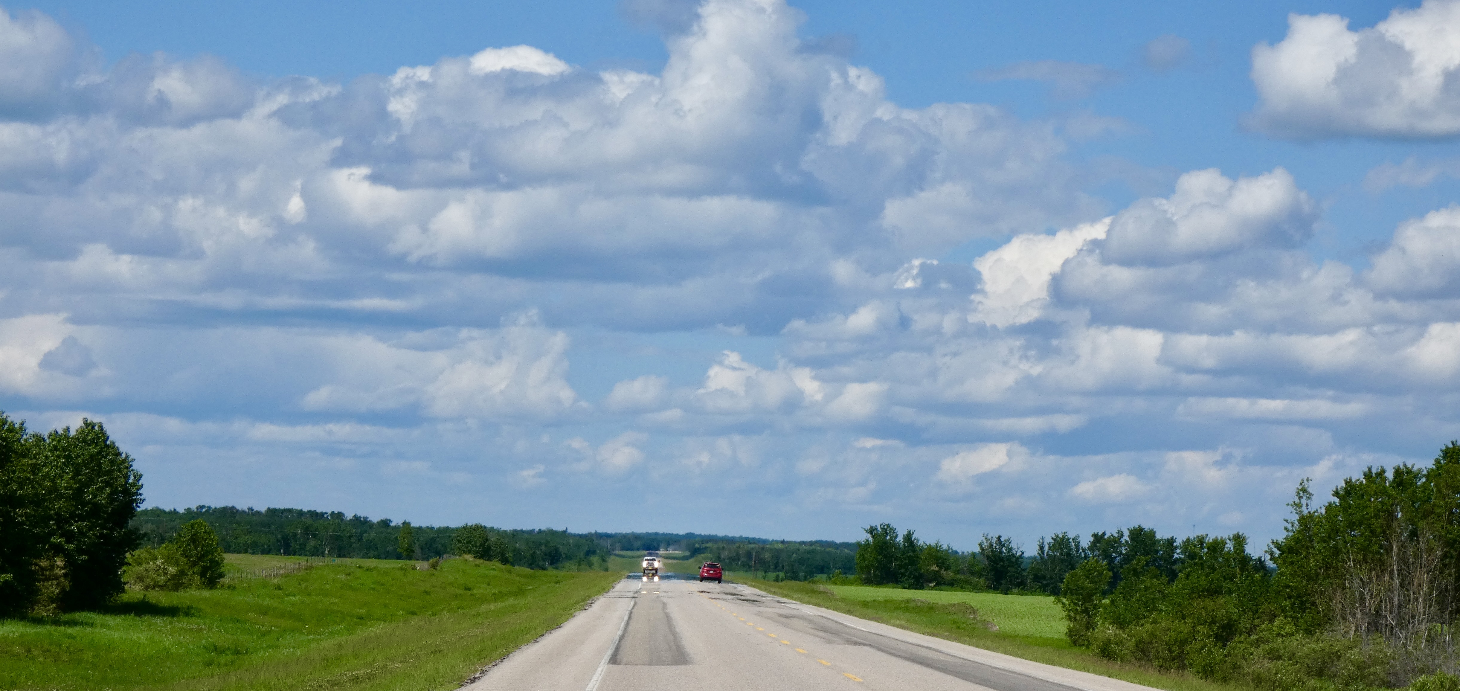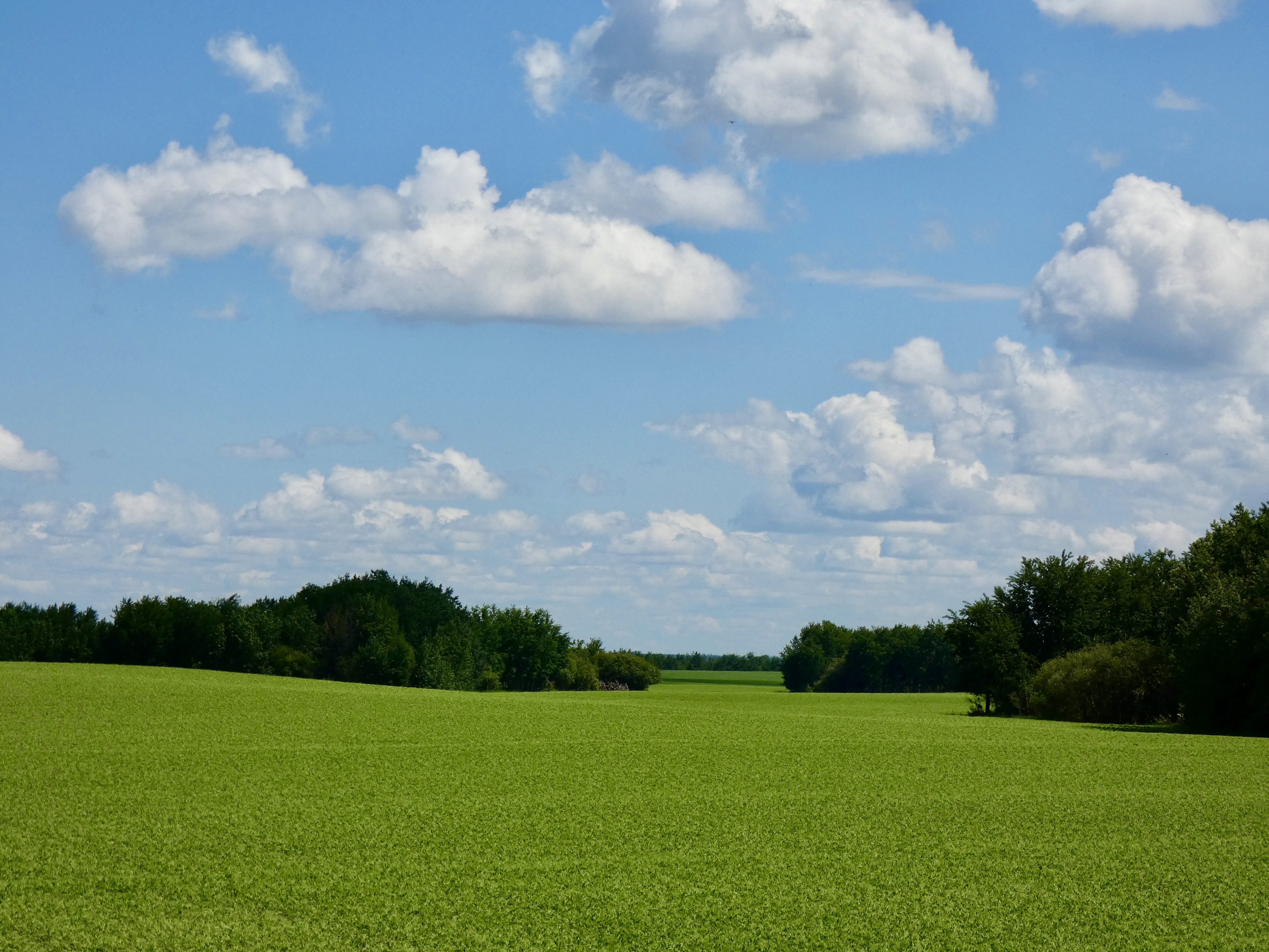 While Saskatchewan doesn’t have as many lakes as Ontario, it equals Manitoba’s 100,000 count. As we rode through the changing landscape, we could see lakes big and small through the trees or beyond a field green with fresh shoots of something. Some hills began to appear in the final miles of our northern diversion, which also made for great lookouts when the road climbed to the top and no trees blocked the view. In some instances, we had an horizon of 10-15 miles with a mix of trees, crops and lakes between us and the horizon. All that green topped with blue skies and white-gray clouds made for stunning views.