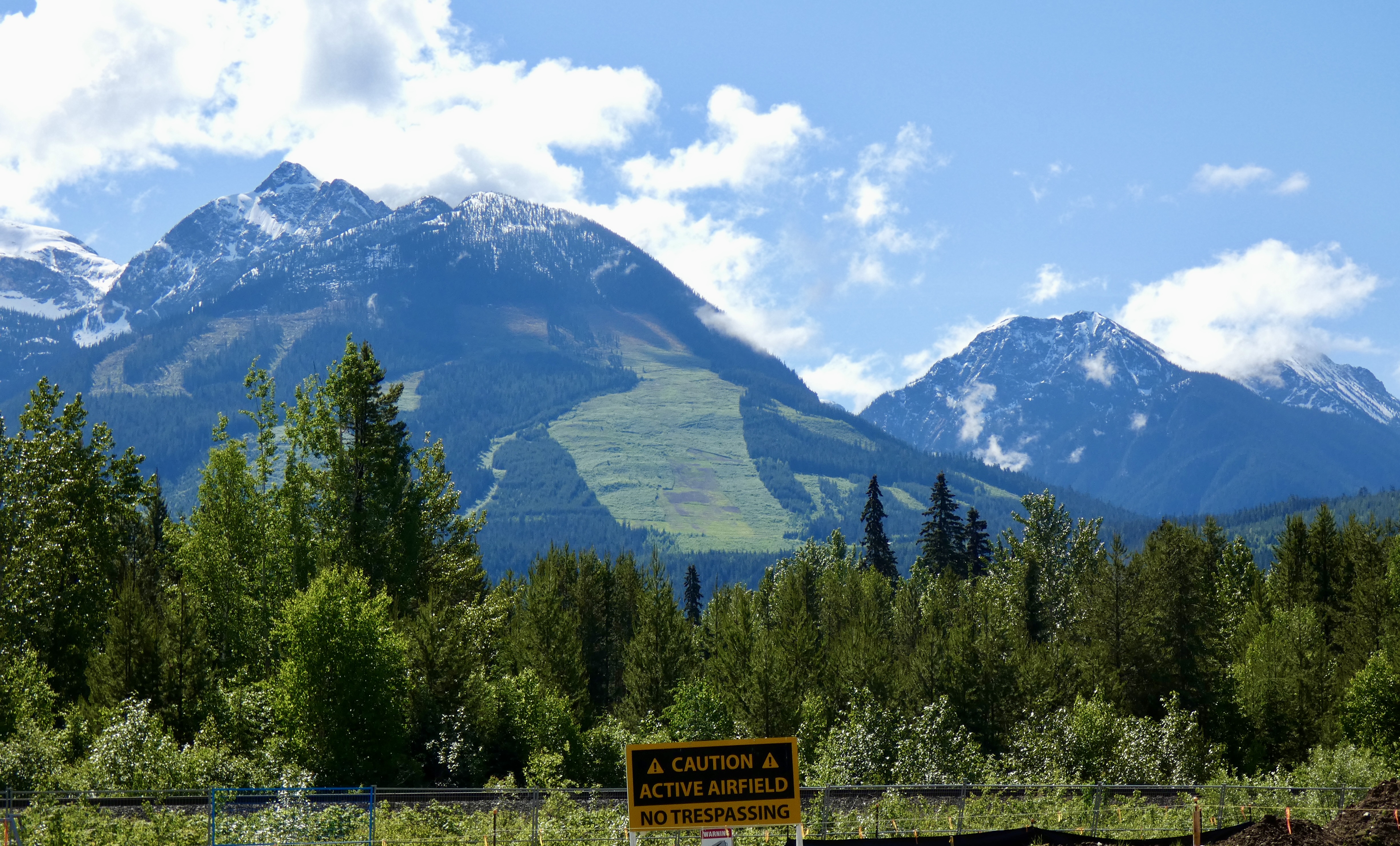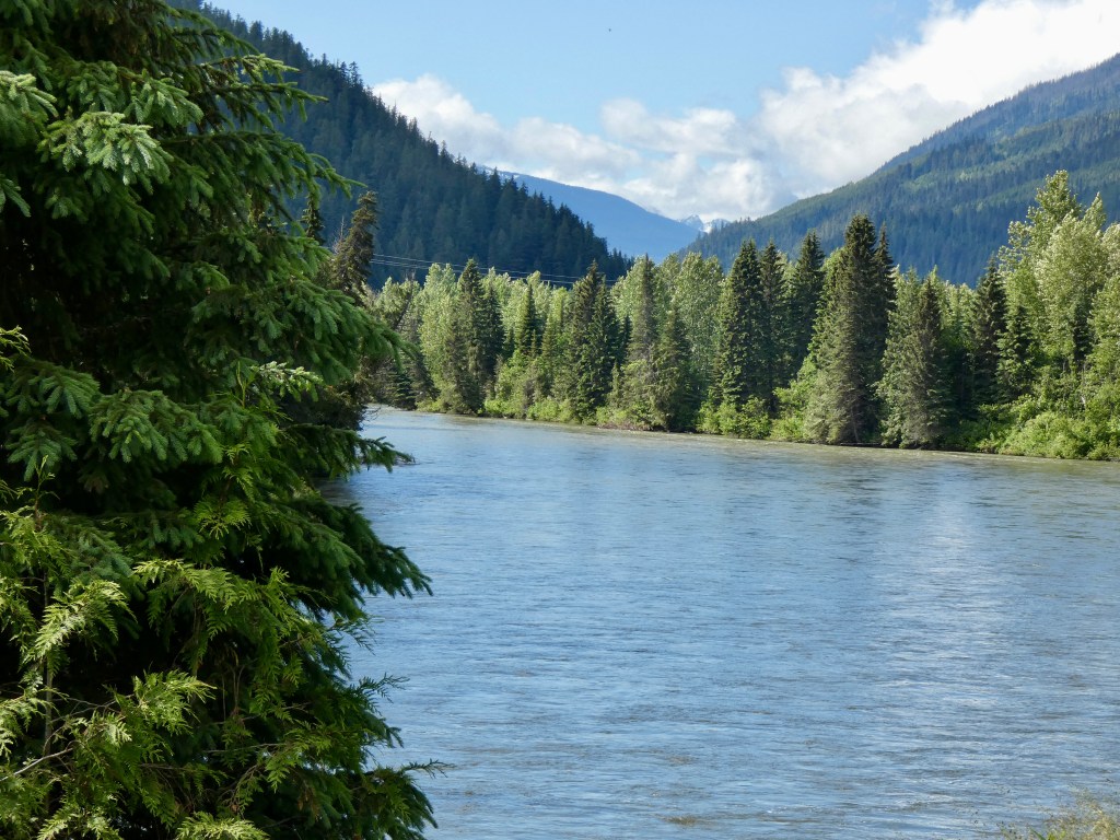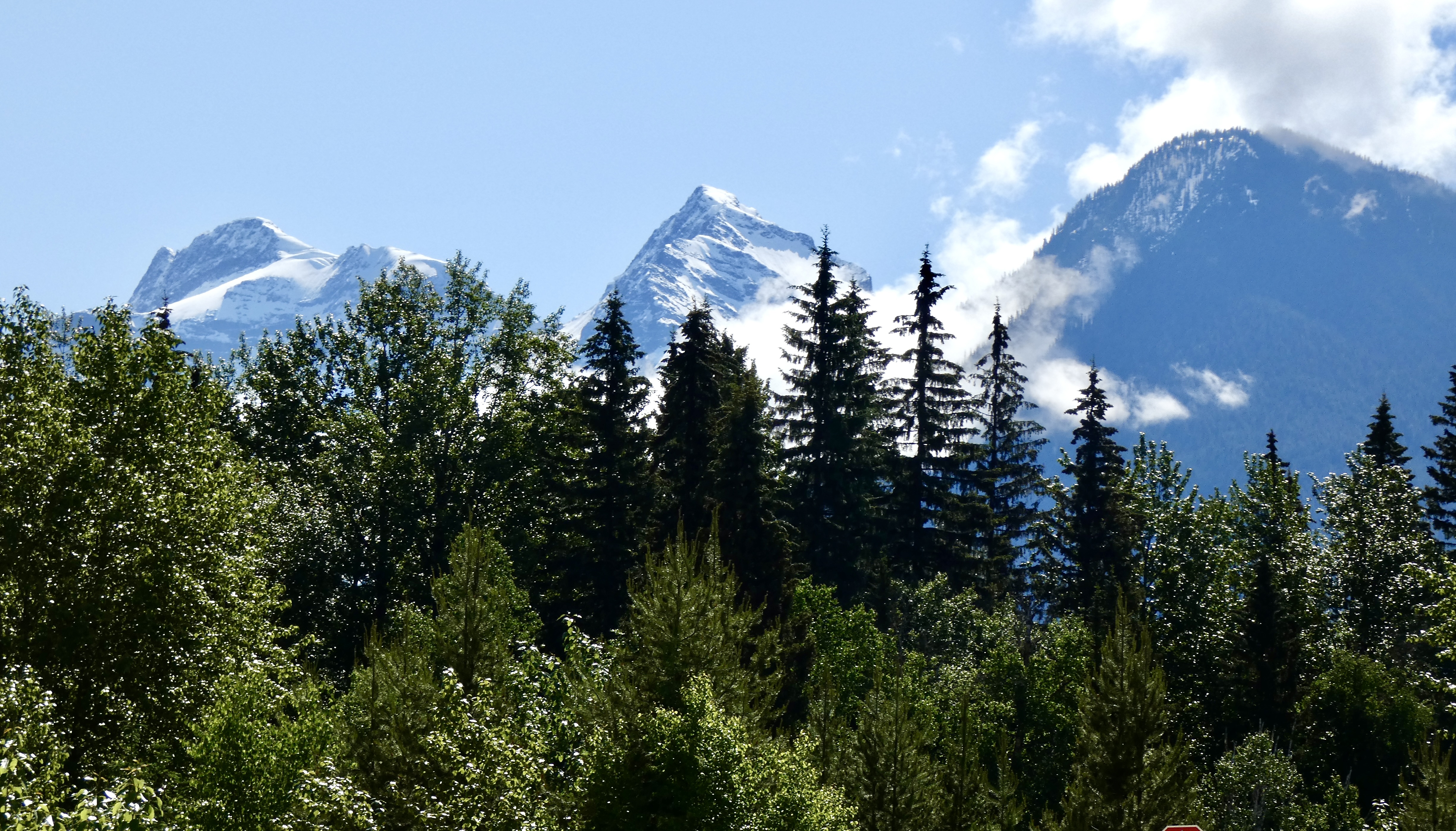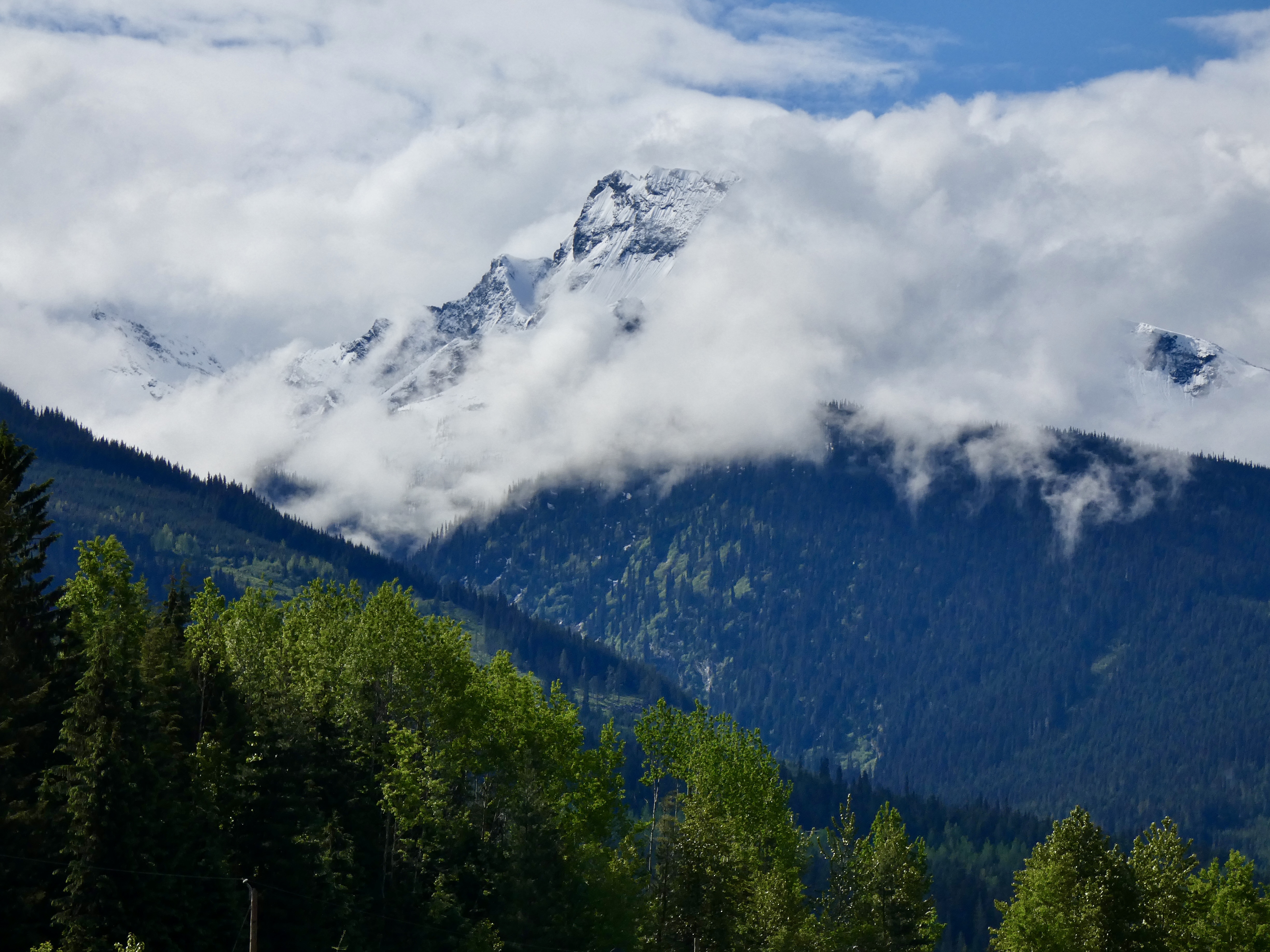 I knew snow-covered mountains surrounded us yesterday, but I never saw a single white-capped peak, hidden as they were by fog and rain. The big mountains lining the Icefields Parkway remained largely unseen by us today, hidden by smaller but still substantial peaks that were our view. Nevertheless, the short 225-mile ride south on Highway 5 through the North Thompson Valley to Kamloops provided enough scenic mountain views through the high, white clouds lingering in the area to mostly satisfy my CCR desire to see Canada’s Rockies in their rugged splendor.