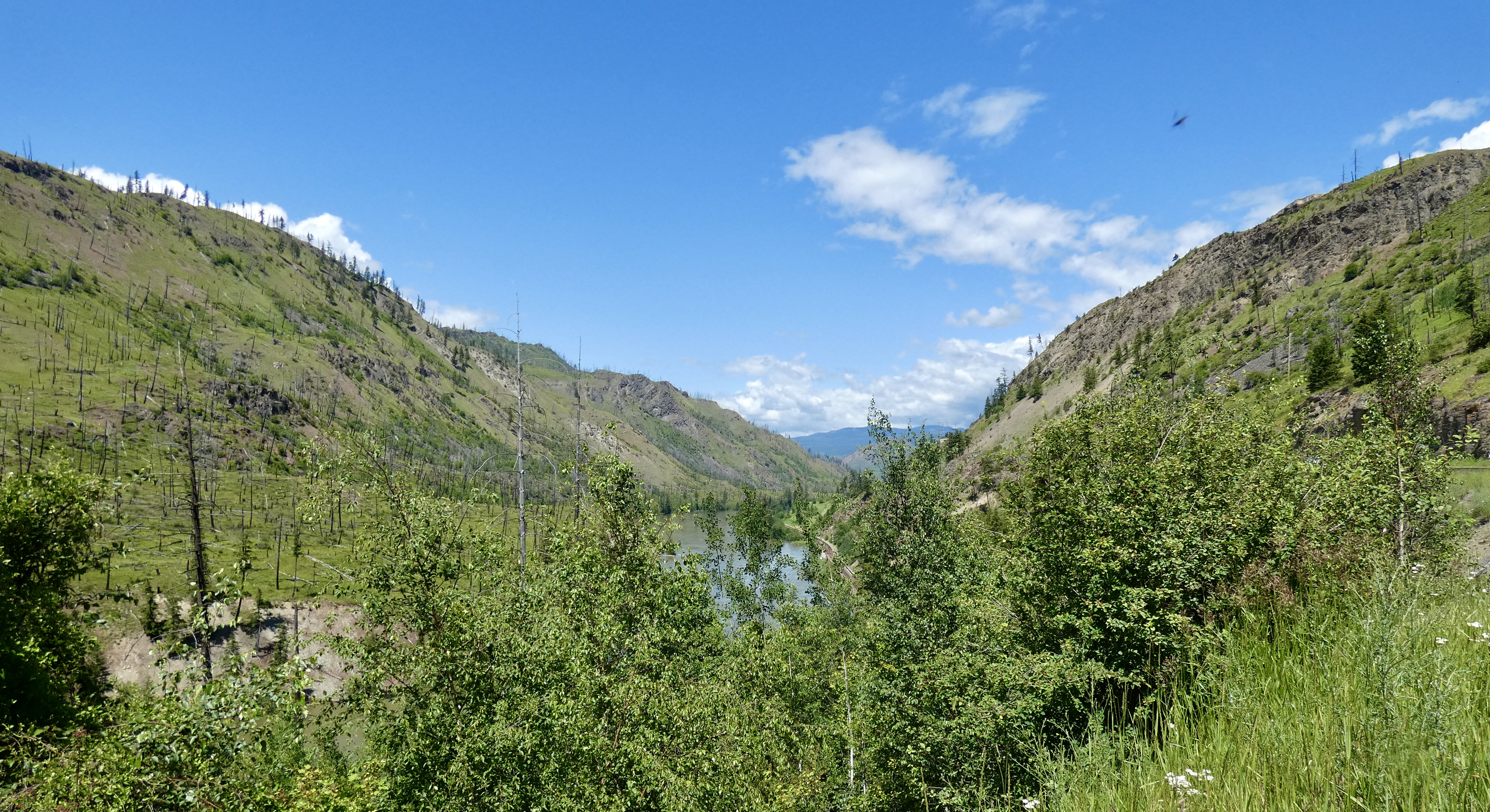 From Valemount, where we spent last night, to Kamloops, the highway hugs the North Thompson River, which, due to the inordinate amount of rainfall in late spring and early summer, is pushing at its banks and in a couple places had spilled onto farmland. The road crosses and recrosses the river a half dozen times, and the old bridges and winding road made for a gratifying, though not challenging, ride. Besides, I was mostly content to remain at the speed limit or below so I could look up and enjoy the scenic valley and the mountains that form it.