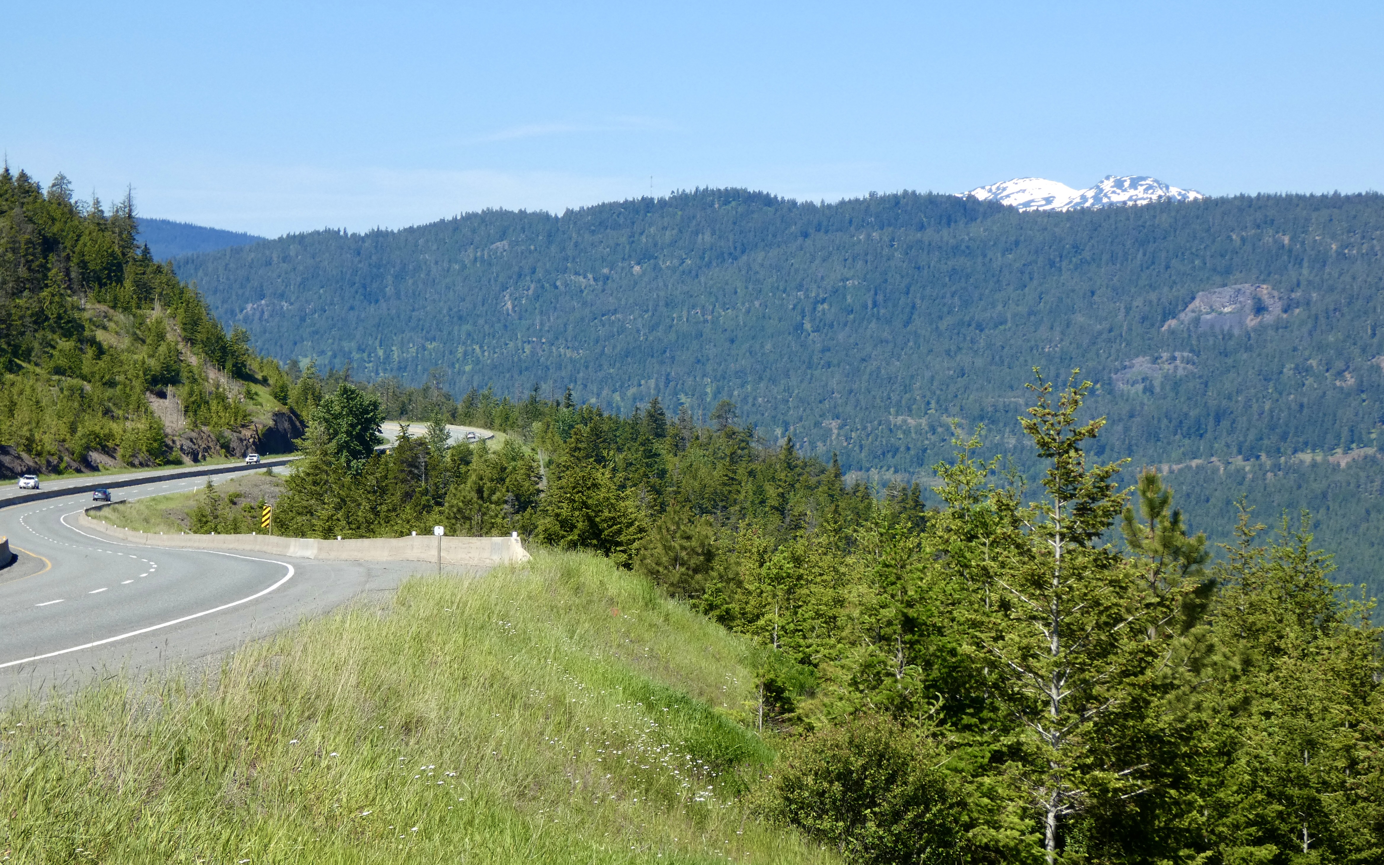 Today, though, the sun was shining, the temperature hovered around 80 by ride’s end and the Coq seemed tame enough. In my travels across Canada I can’t remember seeing a posted speed limit of 120 kilometers per hour (about 75 mph) but that’s the limit on much of BC 5. And while I was going 120 (75), cars whizzed past me at considerably greater speed, perhaps because in the entire two-hour ride I didn’t see a single law enforcement officer. Even at only 120, it’s hard to take in all the beauty: Soaring snow covered peaks, huge fertile valleys, the fast flowing Coldwater and Coquihala rivers. I stopped a couple times to take in the view and take a picture or two, but for the most part we just kept rolling. I’ve found that where there are beautiful views, there is usually no place to pull over; and where there are places to stop, trees and undergrowth frustratingly block the view you briefly glimpsed at 120 kph a mile back.