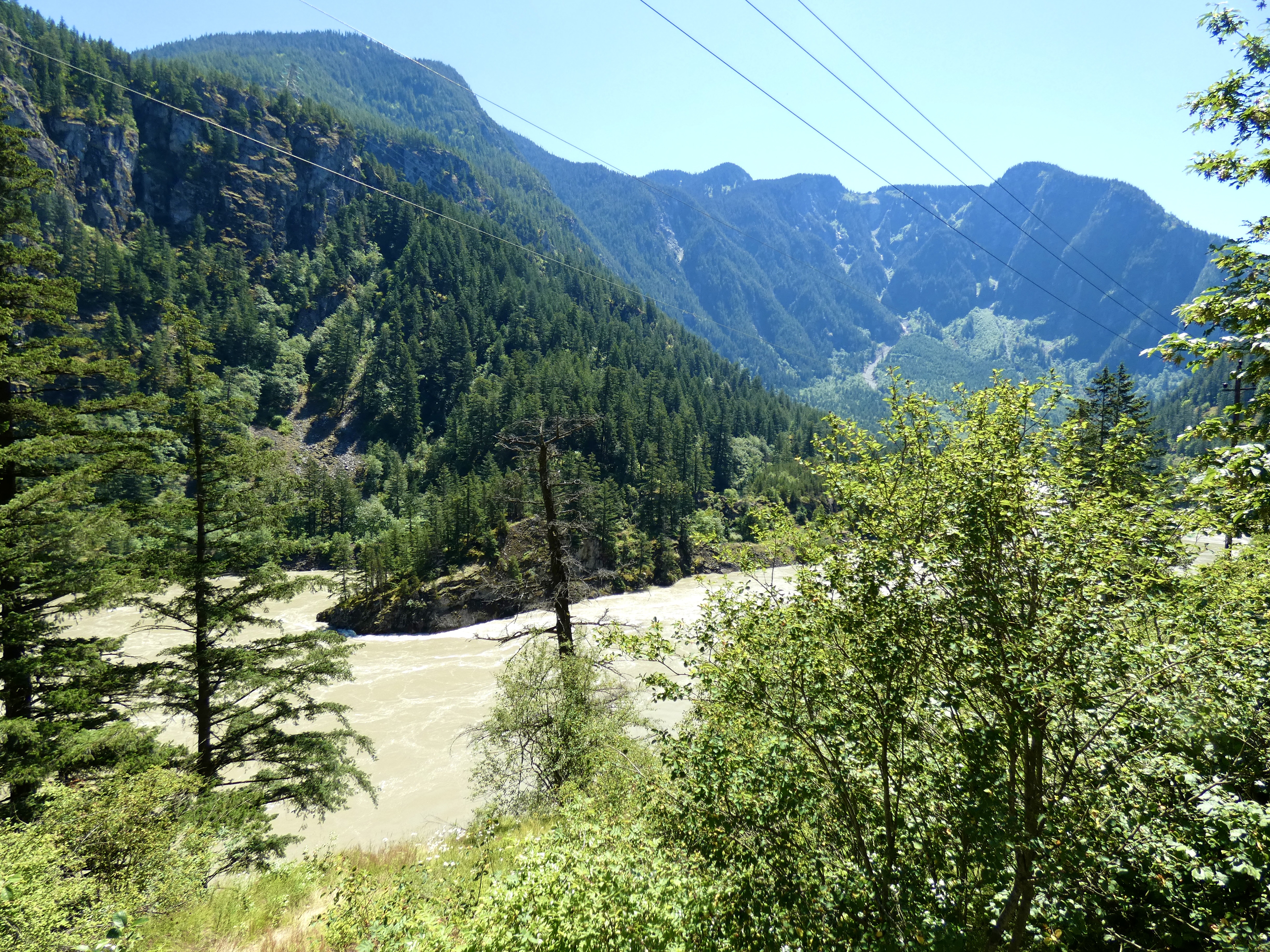 There are two routes to Hope from Kamloops. The short, fast route we took this morning and a longer, scenic route of about 175 miles on the Trans Canada Highway, aka Highway 1. I had wanted to ride both roads, so at noon we started north (east) on the TCH out of Hope, planning to ride as far as we could in two hours, then turn around and retrace our ride back to Hope. Highway 1 follows the mighty Fraser River north to Lytton for about 70 miles, then, where the Thompson River joins the Fraser, the road veers east following the Thompson. Two hours took us about 85 miles up the road, allowing for some photo stops. By then, the landscape had changed dramatically from heavily forested mountain sides to more arid, sparsely-treed mountains. When we went from trees to no trees, the temperature went from 80 to 90, and we turned around and headed back. I would like to have continued on, but four hours on the bike in the afternoon after three hours in the morning, felt like enough riding, and I needed to get back to check on plans for the final three days in Canada.
