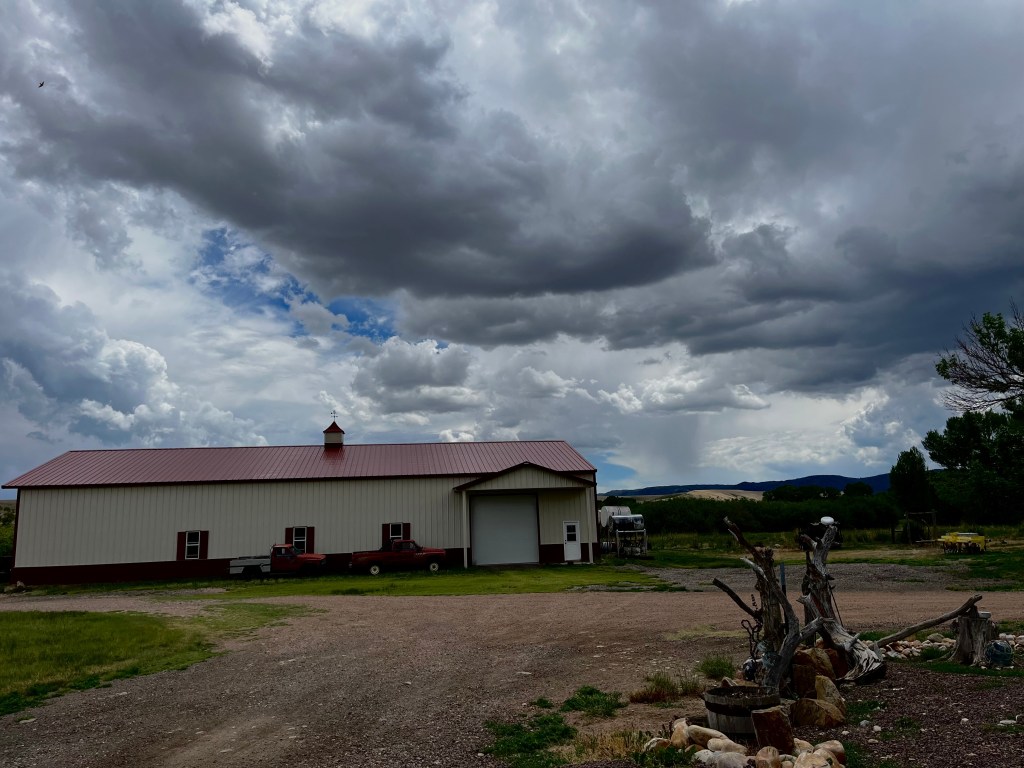 So we watched the sky. On the plains of Wyoming one can see for miles, sometimes as much as 50 miles. We could see rain falling on neighboring ranches, but the storms seemed to be bypassing Linda’s place. Then, from the direction of Sheep Mountain we could see a cloud headed our way with rain. It came and it went, leaving behind only .04 inches of rain. Less than a tenth of an inch. But Linda was grateful for what little she got and looked forward to Wednesday when weather forecasters predicted there might be more rain. In the meantime, she goes about her business, taking care of what she can and trying not to worry about the things she can’t control.