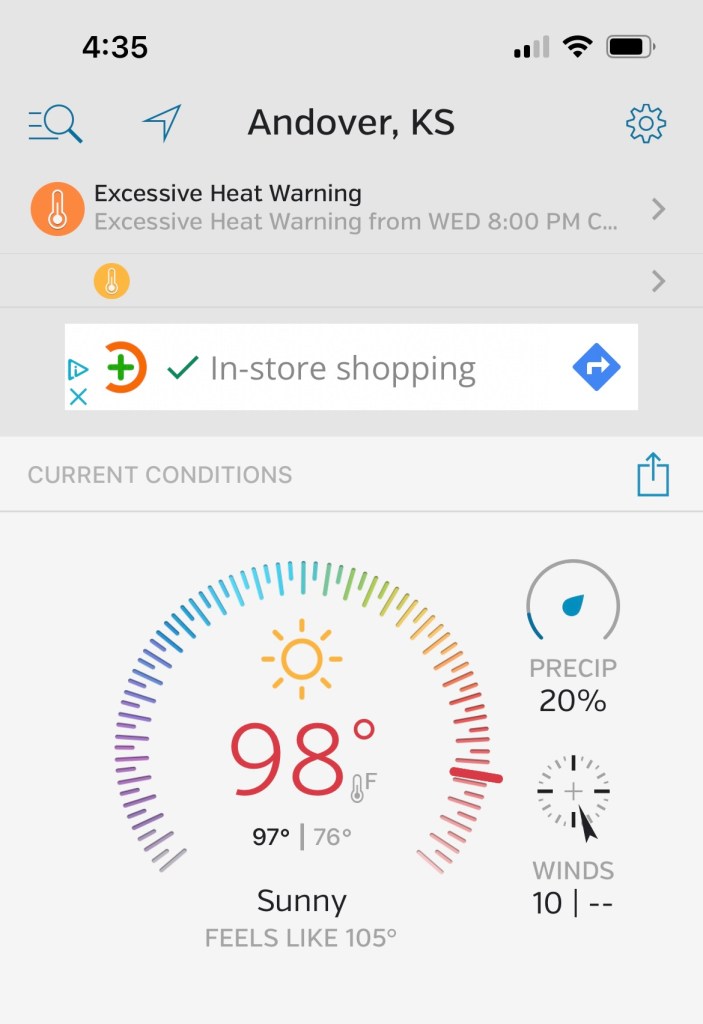 Before I get into today’s activities, let me make one thing clear. Today was hot. While the Weather Underground screen shot of Andover, where Jon lives, only shows 98° at 4:30, I’m pretty sure that sometime today I was working or riding in triple digit temperatures. It was hot.