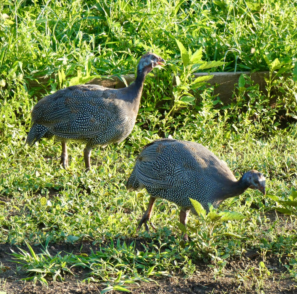 We relaxed most of the afternoon since it was too hot to do much outside, but I went out later in the afternoon to look at Jon’s several unfinished projects, some of which relate to his growing menagerie. He used to have a dozen chickens but a coyote nabbed eight of them, so he’s down to four with more on the way via U.S. mail. Really. You can order chicks and have them sent through the mail. Who knew. Since I was last here he added three turkeys and four guinea hens. For now, they’re in a pen part of the day, but he lets them roam the yard most of the time. He’s building a “chalet” for the turkeys with an enclosed run. I guess the guinea hens will stick with the turkeys, with whom they seem to have bonded. The chickens, when he has a full complement, produce more eggs than he can eat. I think he gives the extras away. He also has a dog, Harley, and his daughter’s cat visits often. No large animals. Yet.